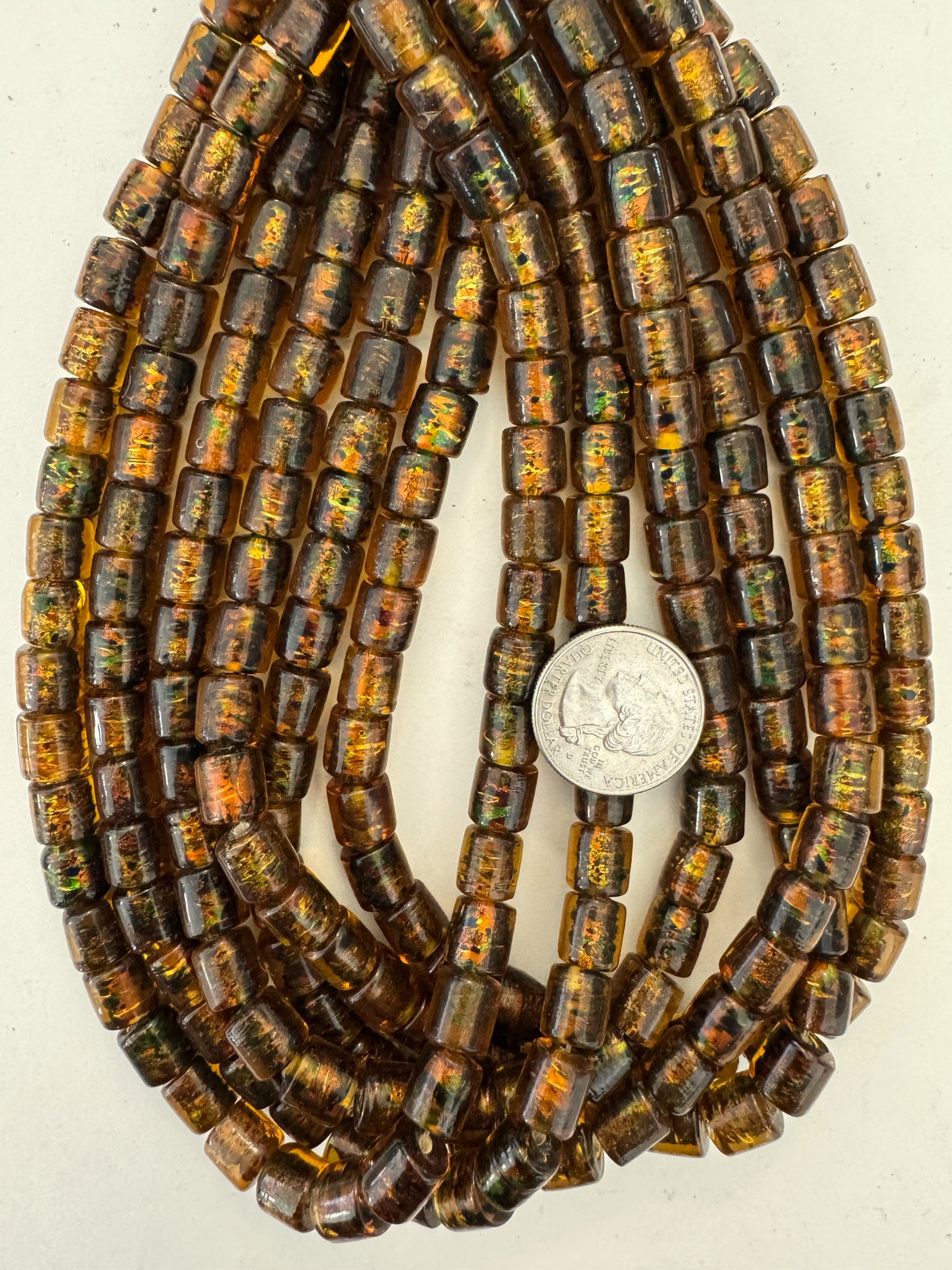 dark brown golden amber green swirl, vintage look glass, 10x9mm barrel tube, 15" strand, sold per strand