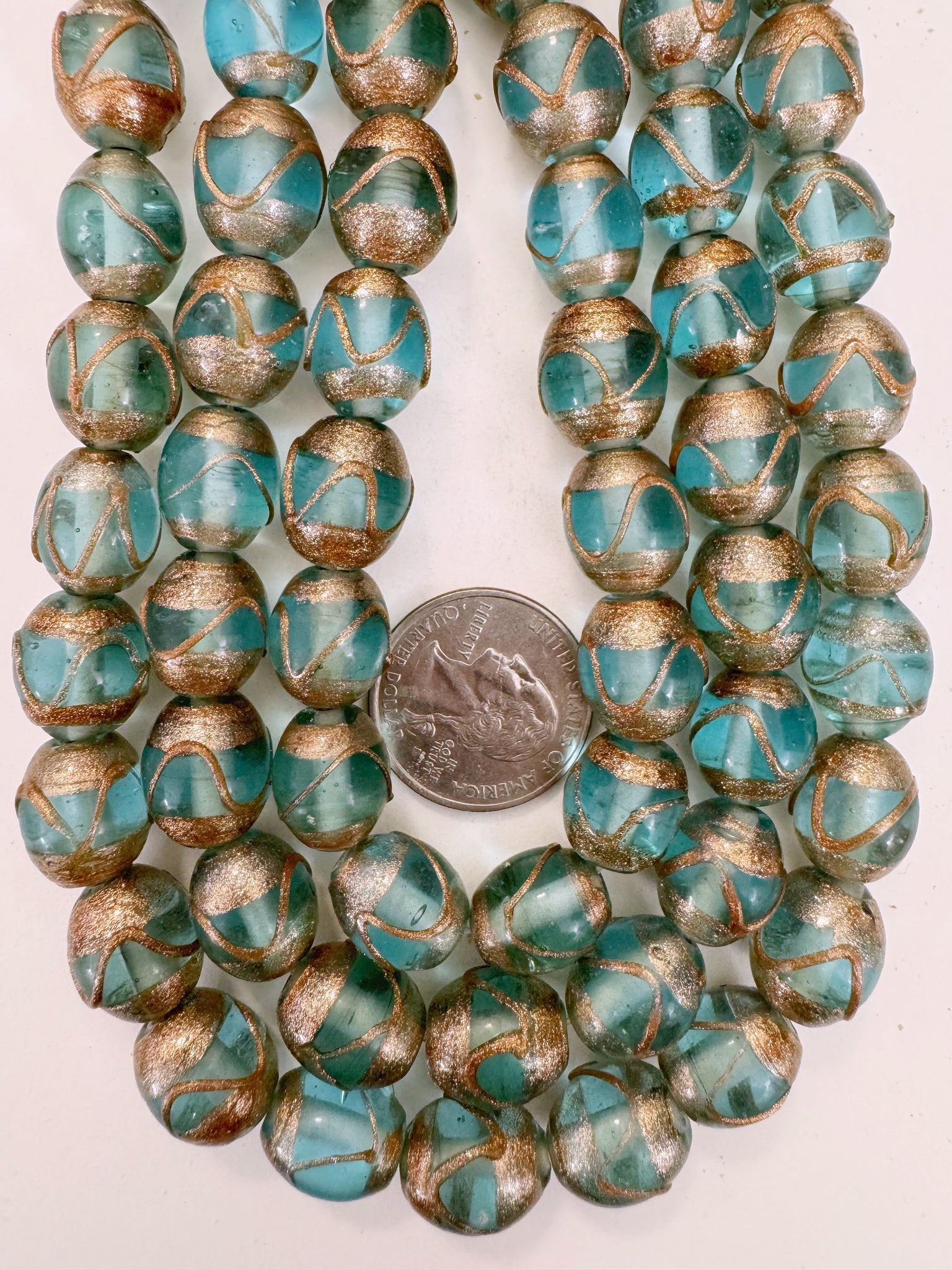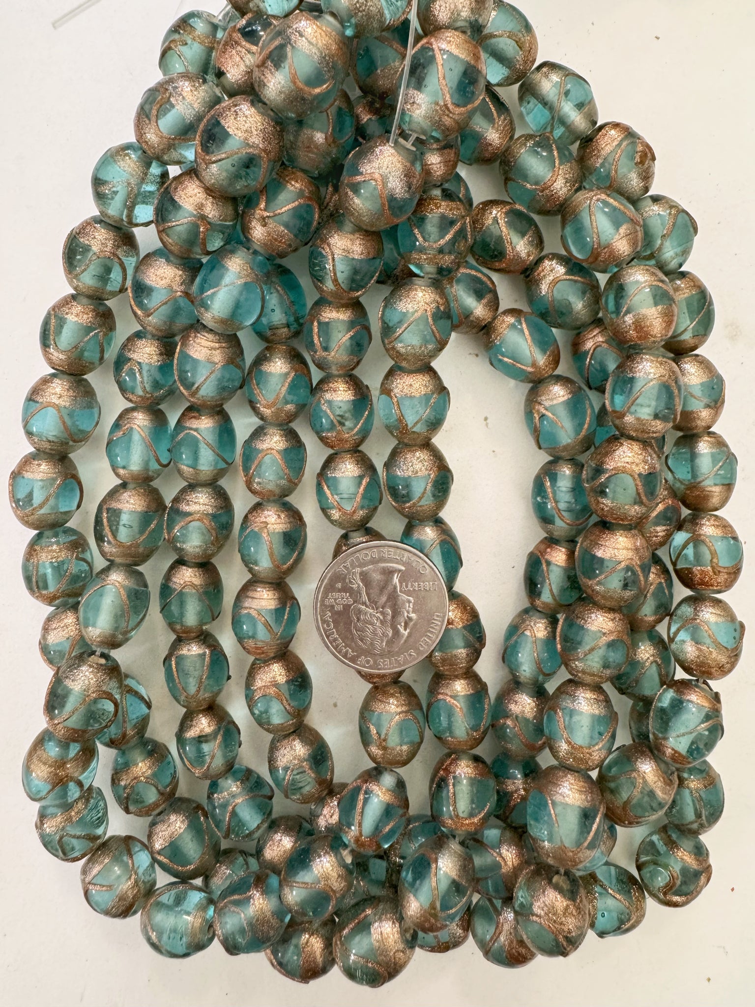 light blue metallic copper swirl, vintage look glass, 14x12mm barrel, 15" strand, sold per strand