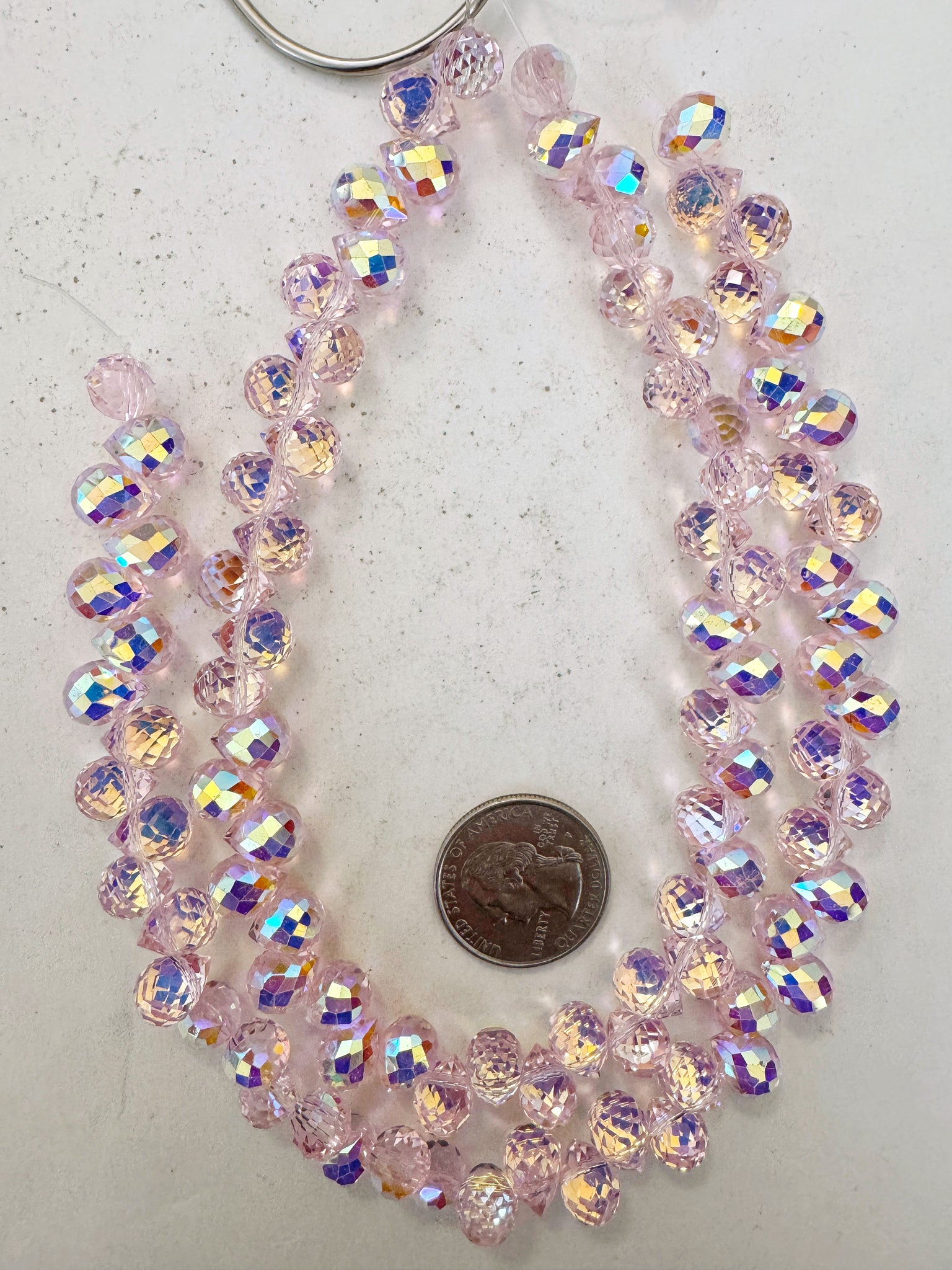 light pink, AB coating, glass, 10x8x8mm fancy cut faceted teardrop briollete pendant, 11" strand, sold per strand
