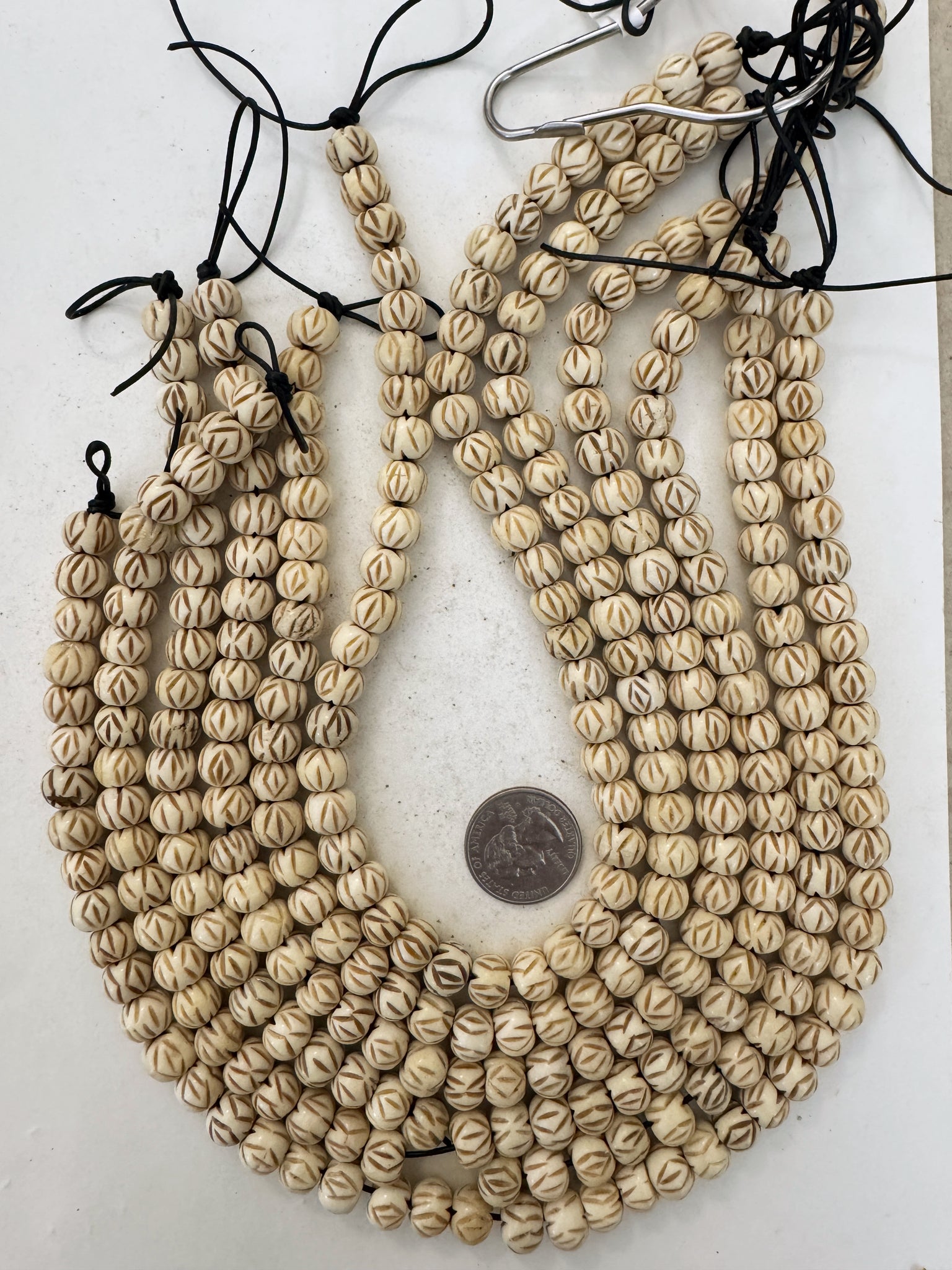 off white, carved dark crossing lines eye motif, vintage stock bone, 10x8mm rondelle, 15" strand, sold per strand