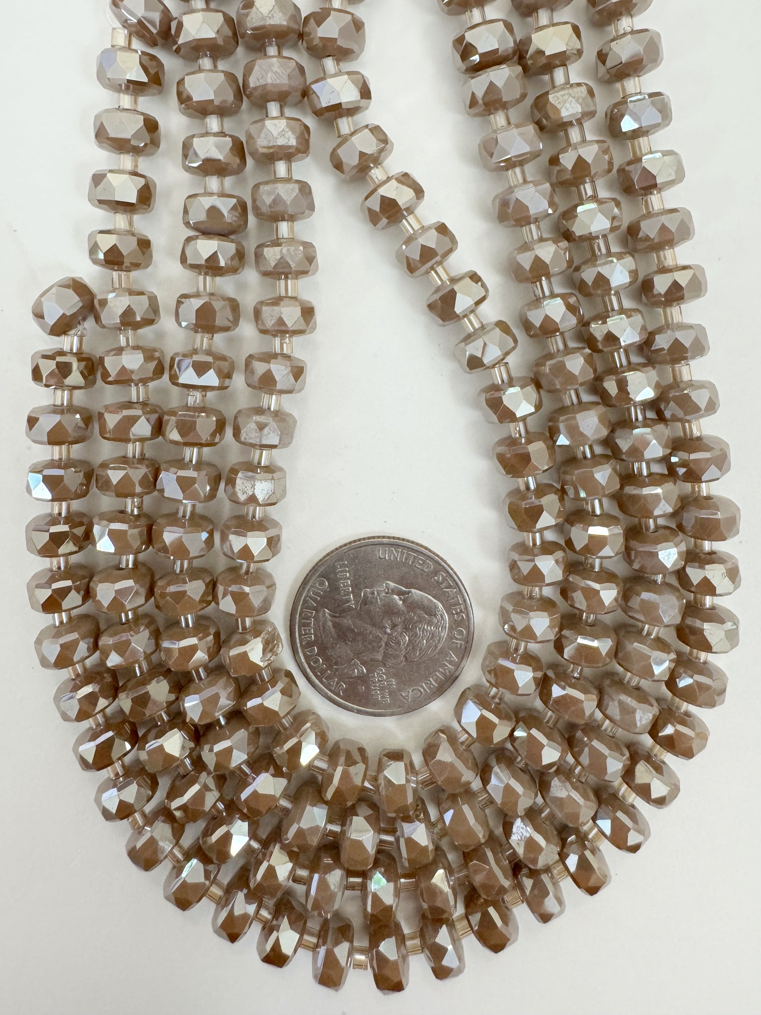 white flash coated pastel dark red brown, fancy cut, vintage look glass, 8x5mm edge faceted heishi rondelle, 10" strand, sold per strand