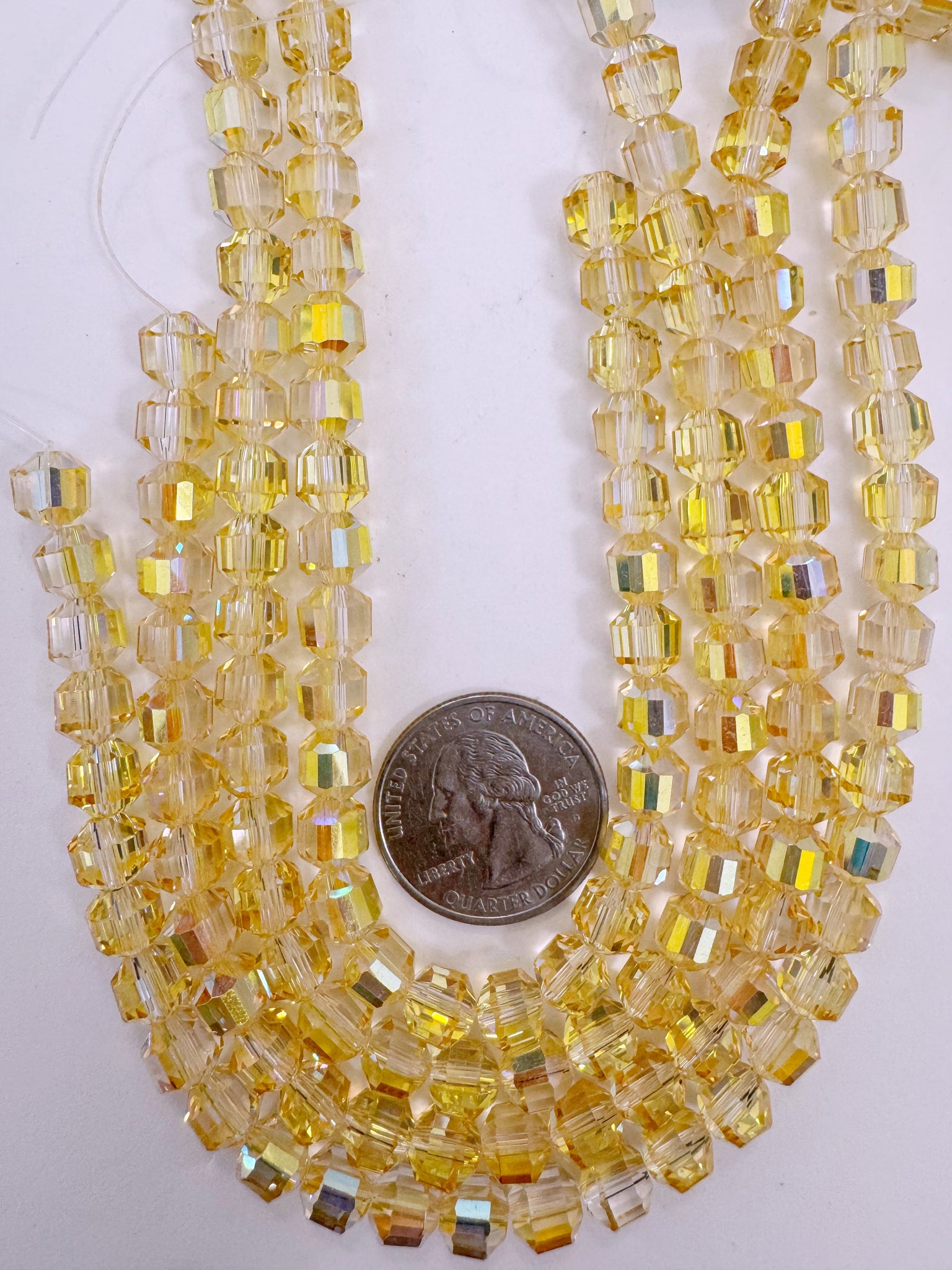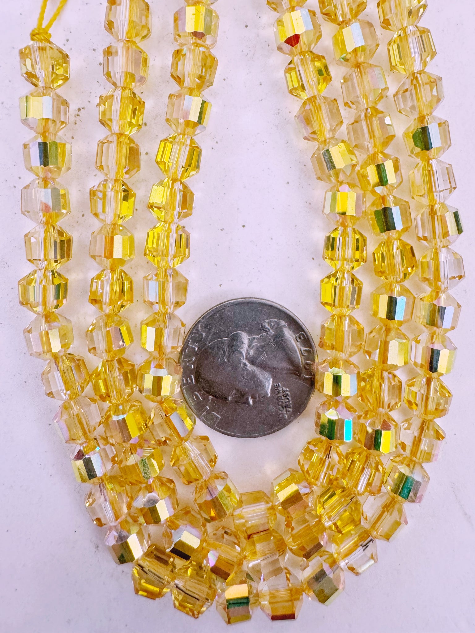 yellow AB flash coated clear, fancy cut, vintage look glass, 7mm faceted bicone barrel, 9.5" strand, sold per strand