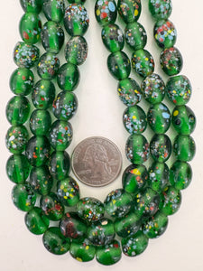 dark green multi color dotted, vintage look glass, 12x10mm bowed tube, 15" strand, sold per strand