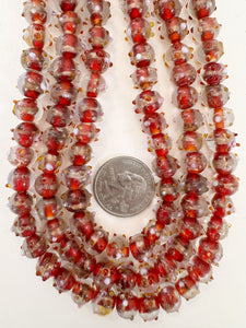 clear red white pink inside lined dotted, vintage look glass, 10x9mm rondelle mix, 15" strand, sold per strand