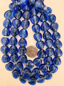 blue light metallic silver green red inside lined dotted motif, vintage look glass, 12x9mm heart, 15" strand, sold per strand