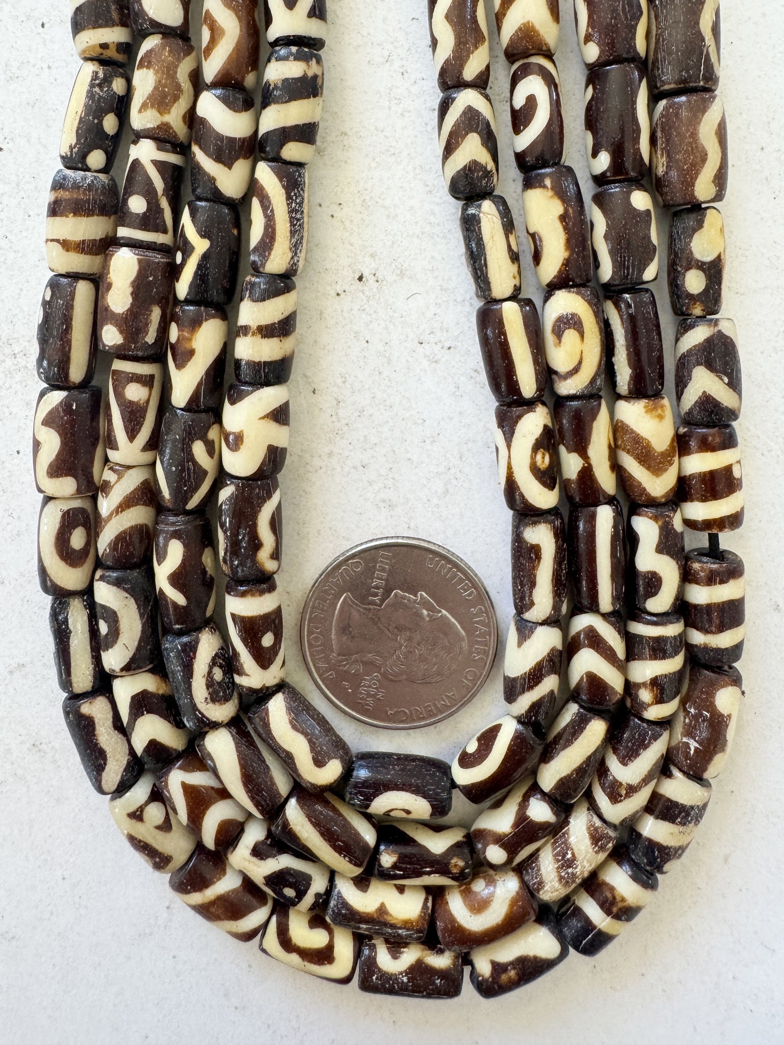 dark brown off white, mixed design motifs, vintage stock bone, 13x7mm tube, 15" strand, sold per strand