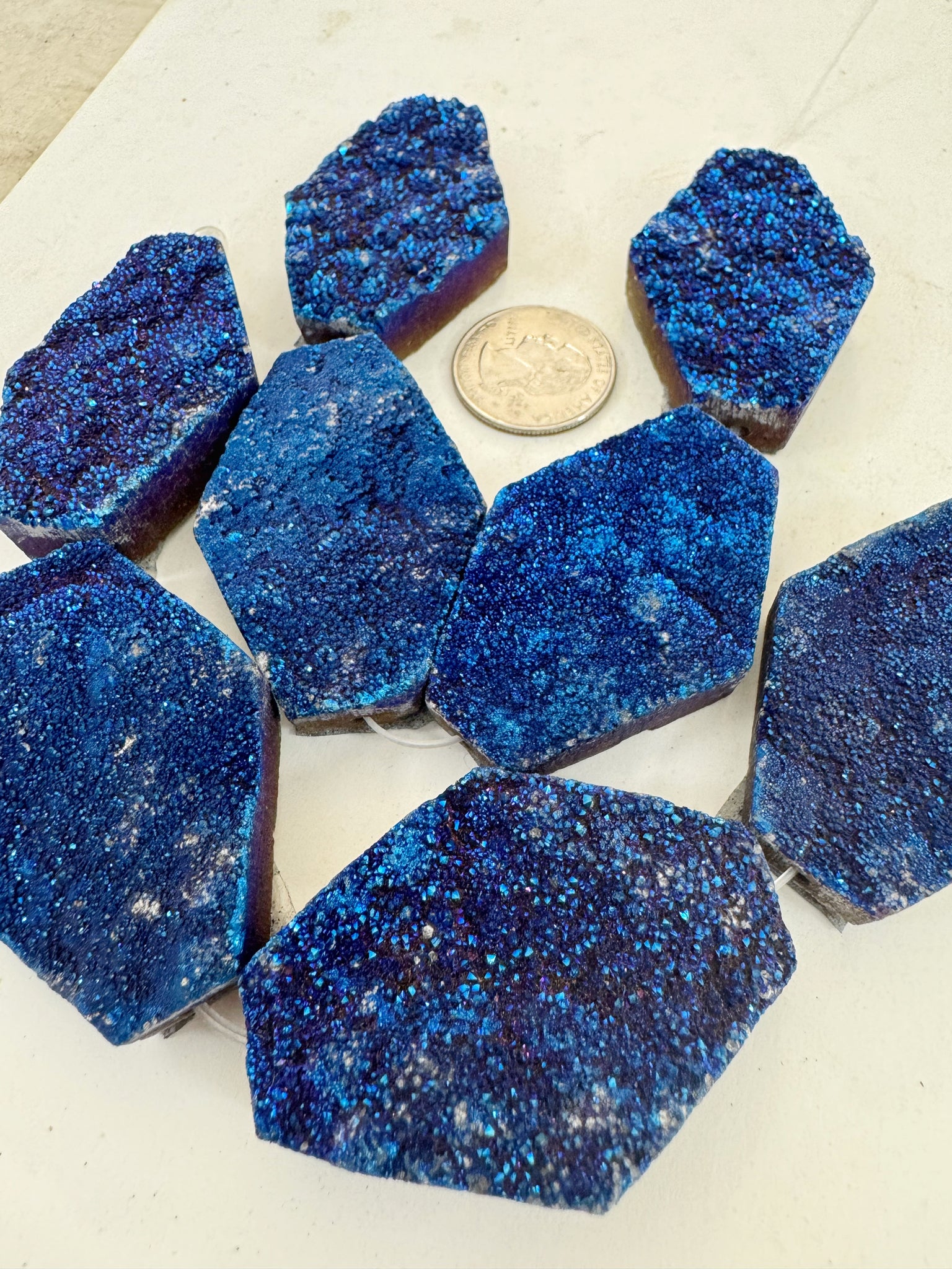 dark electric blue coated druzy quartz, 50x36x10mm hexagon, 4 piece strand, sold per strand, may have edge of surface wear