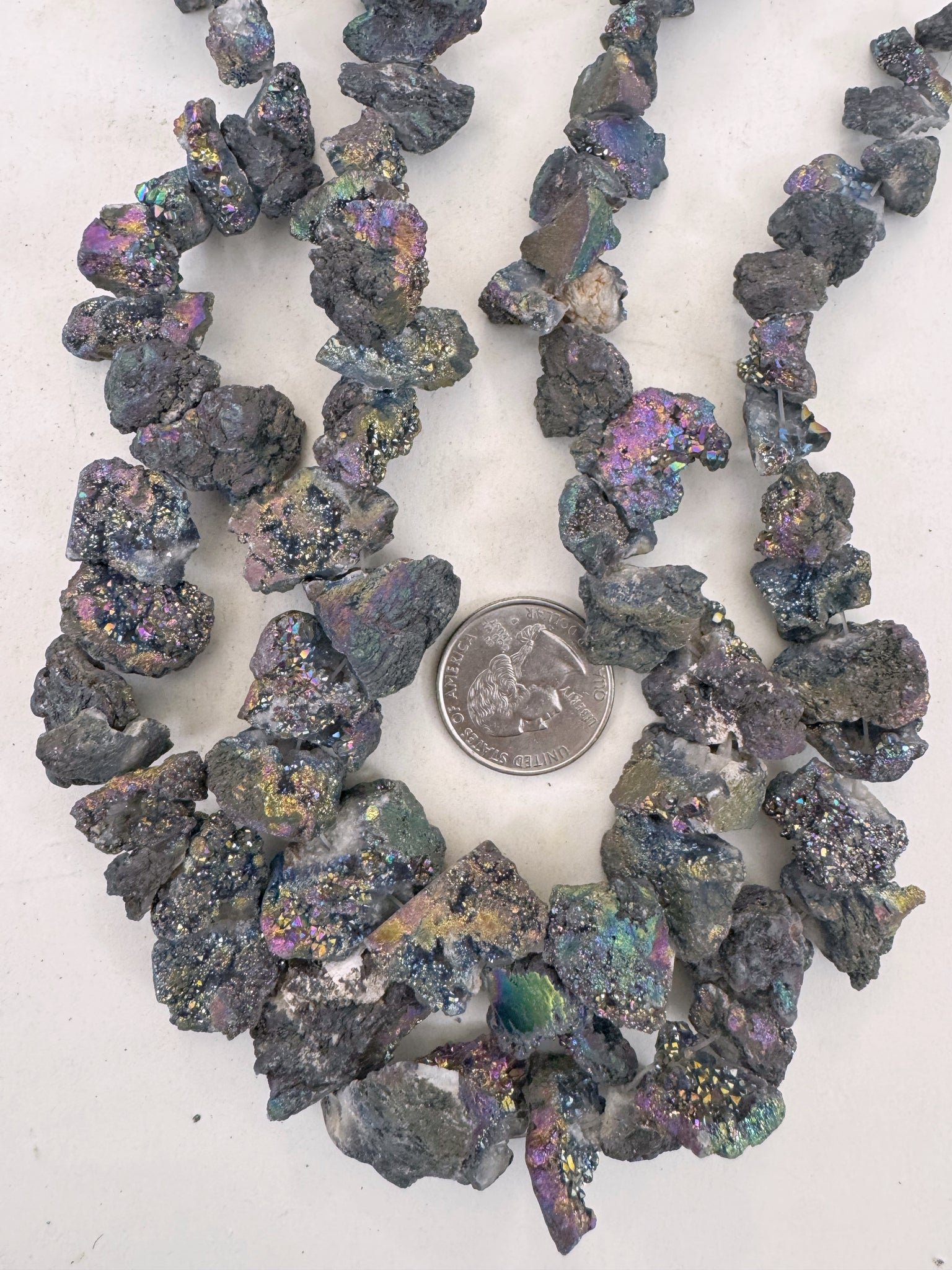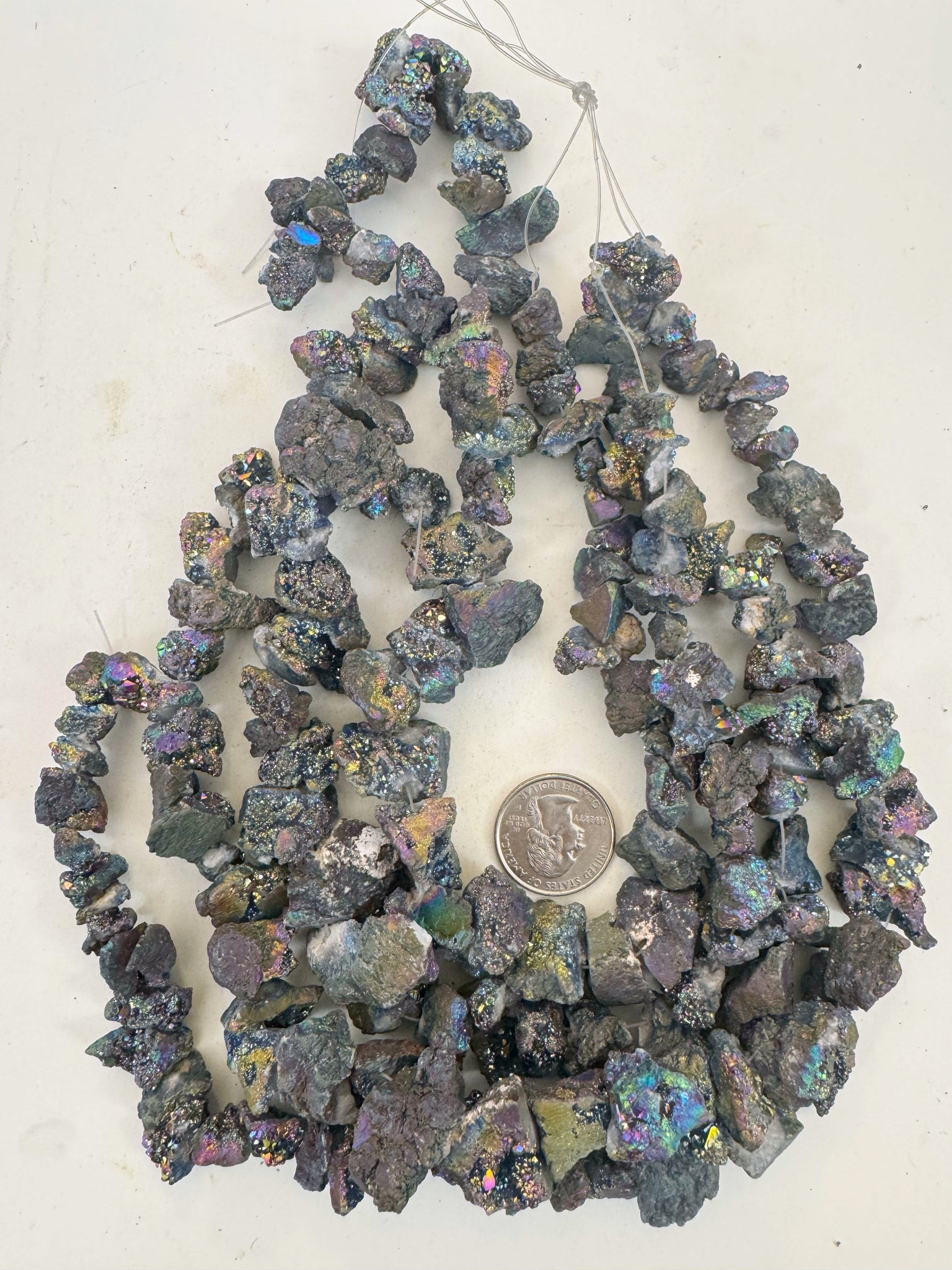 dark gray pink purple green yellow coated druzy quartz, 7-25mm rough nugget, 15" strand, sold per strand, may have edge or surface wear