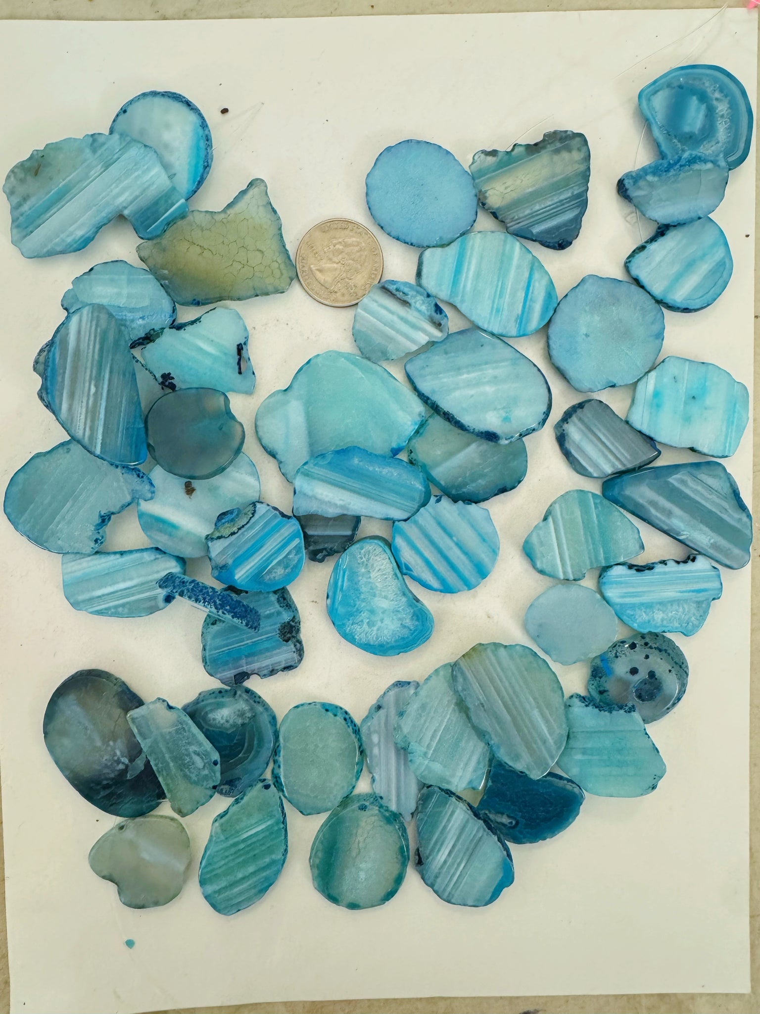 bright blue enhanced agate, 25-50mm slices pendants mix, 15" strand, sold per strand