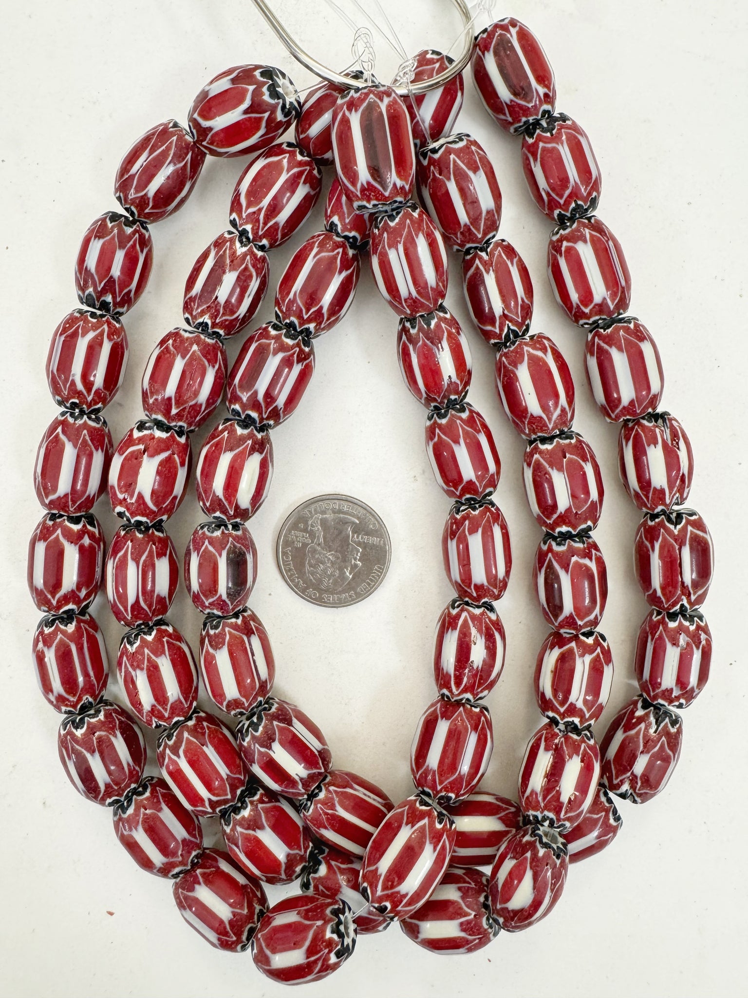 dark pale red white black chevron motif, vintage look glass, 21x16mm barrel mix, 15" strand, sold per strand