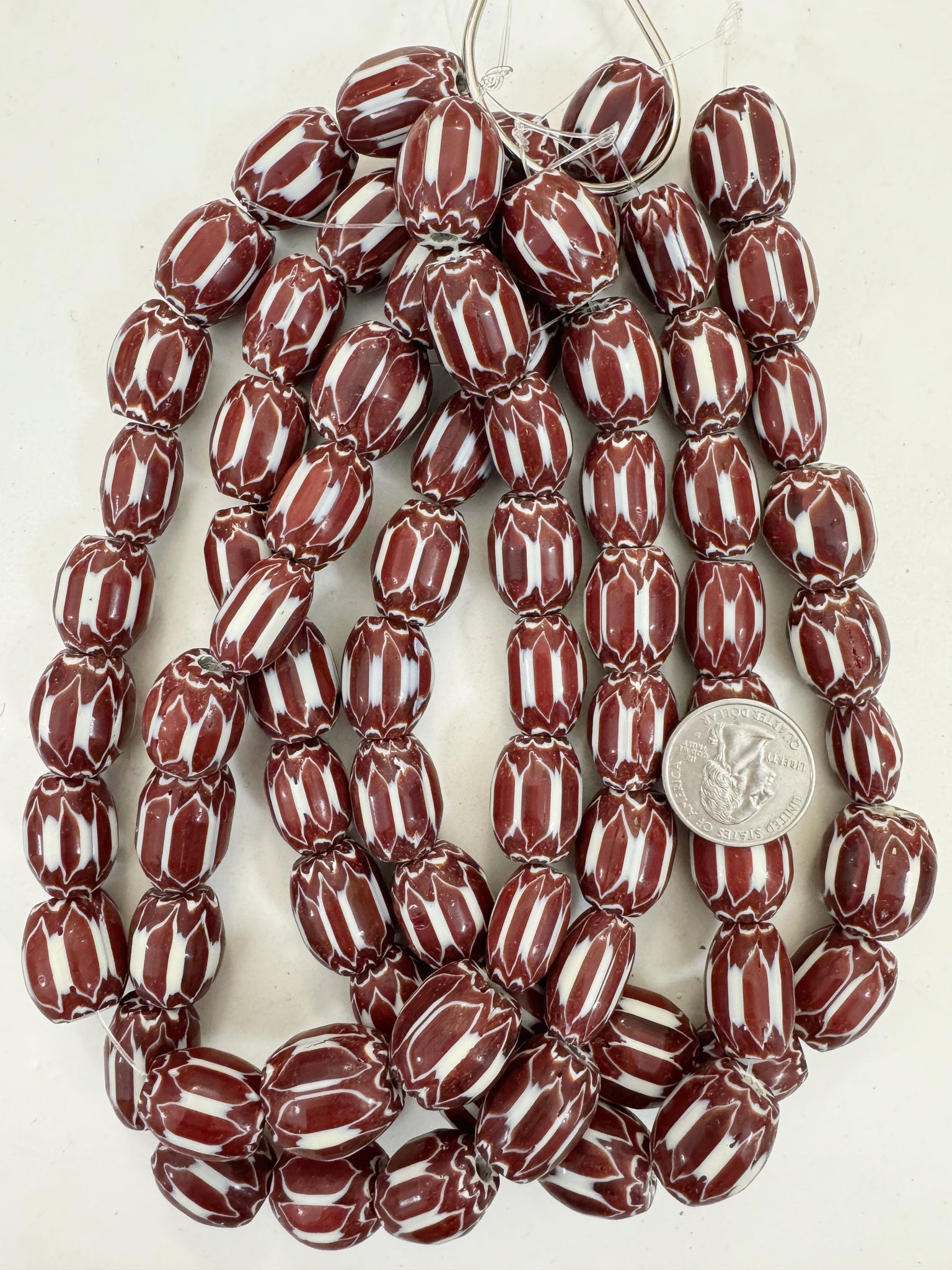dark red brown white black chevron motif, vintage look glass, 21x16mm barrel mix, 15" strand, sold per strand