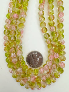 lime green pink green clear crackle motif, vintage look glass, 8mm round, 15" strand, sold per strand