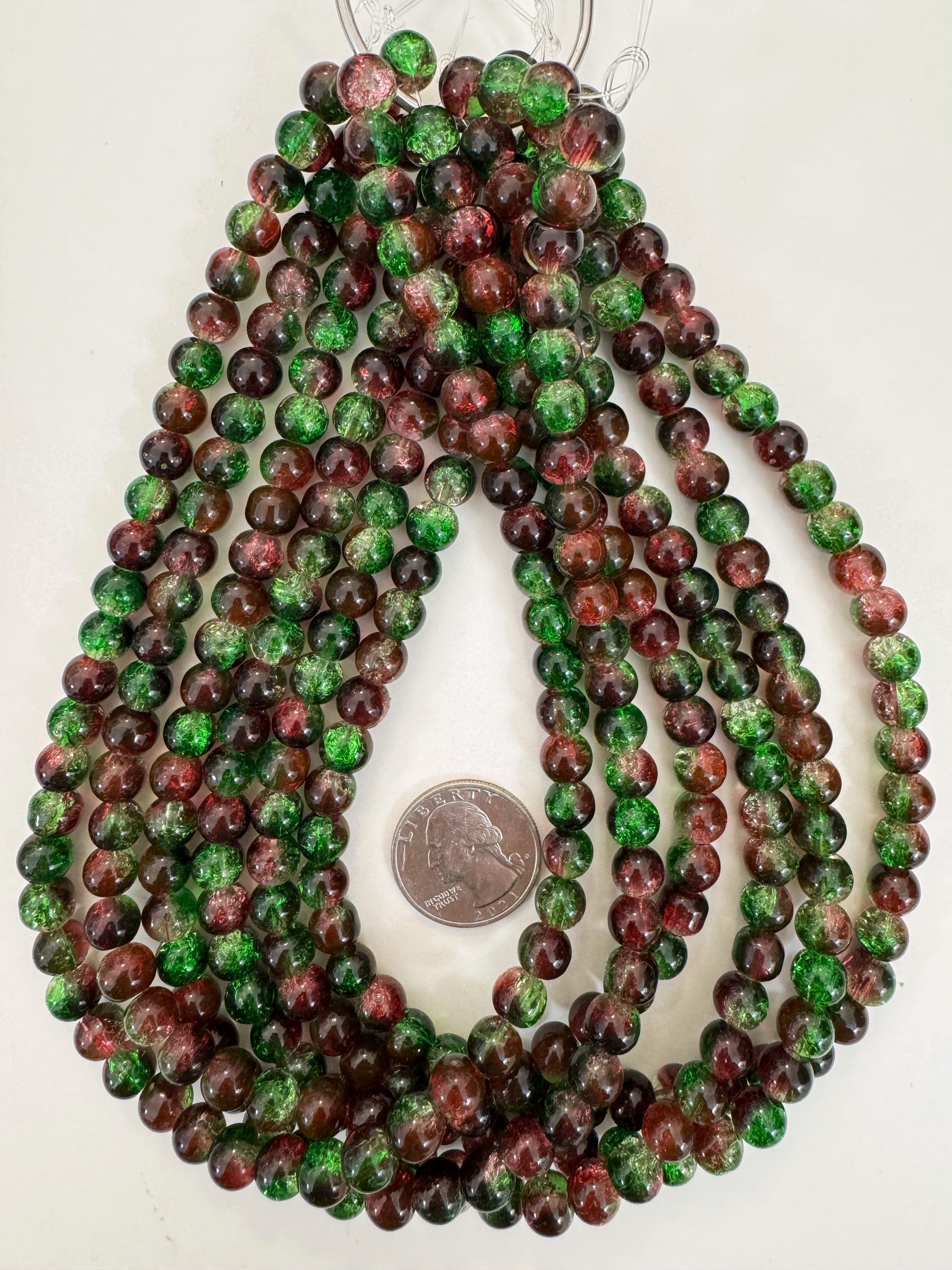 dark maroon red green clear crackle motif, vintage look glass, 8mm round, 15" strand, sold per strand
