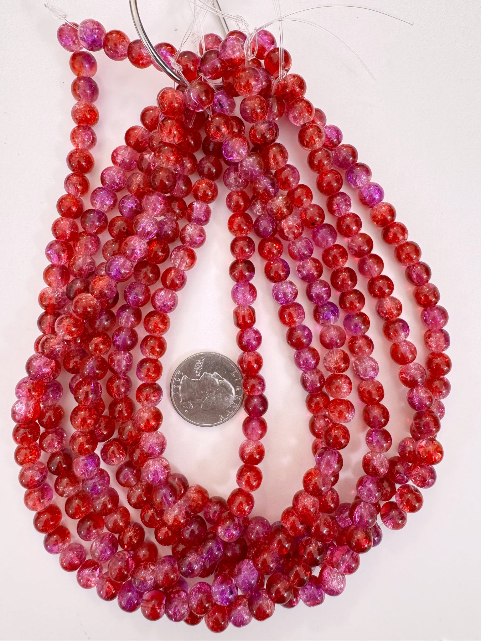 red purple clear crackle motif, vintage look glass, 8mm round, 15" strand, sold per strand