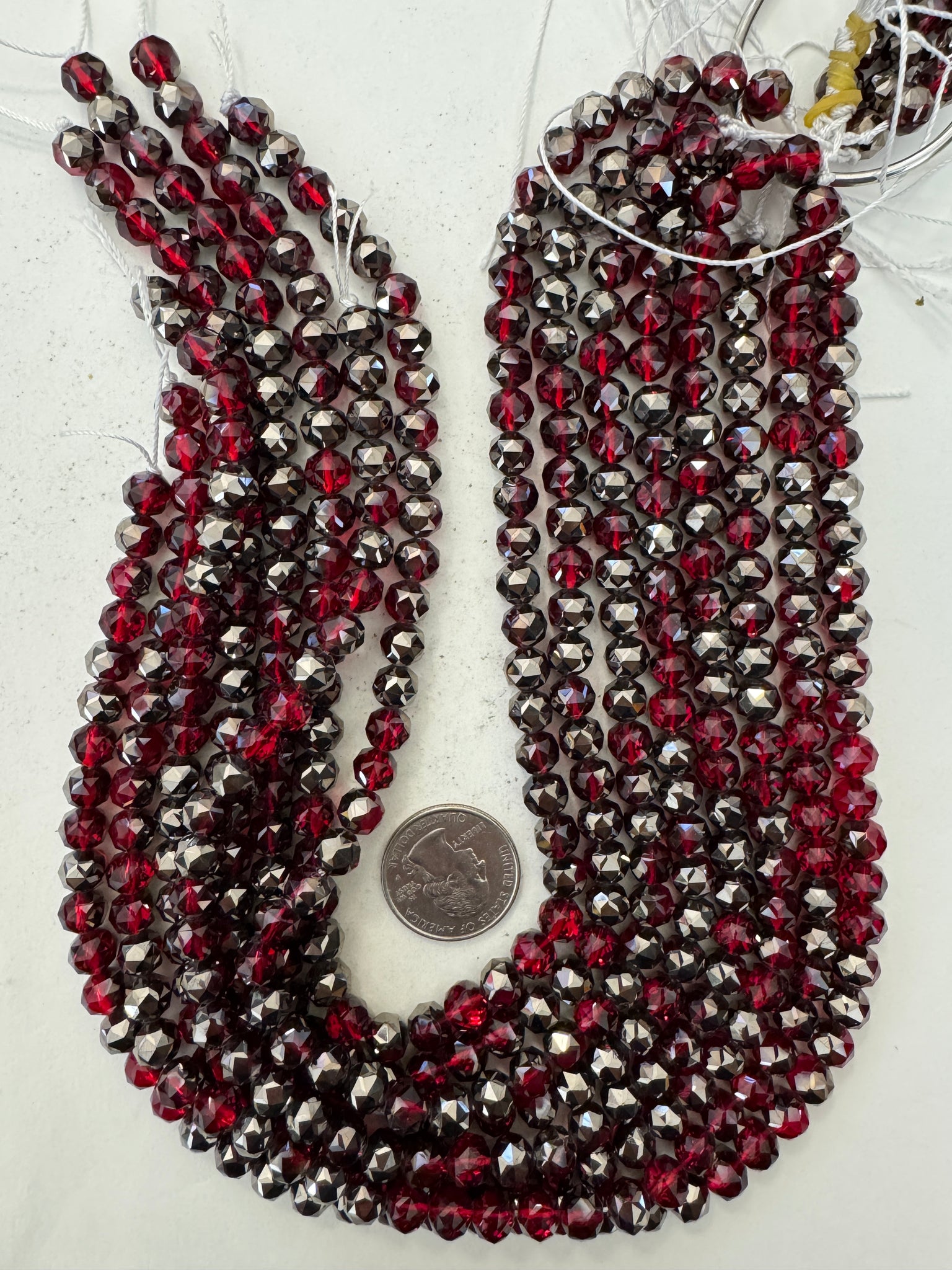 dark red, antique silver coated, glass, 8x7mm fancy cut faceted rondelle, 15" strand, sold per strand