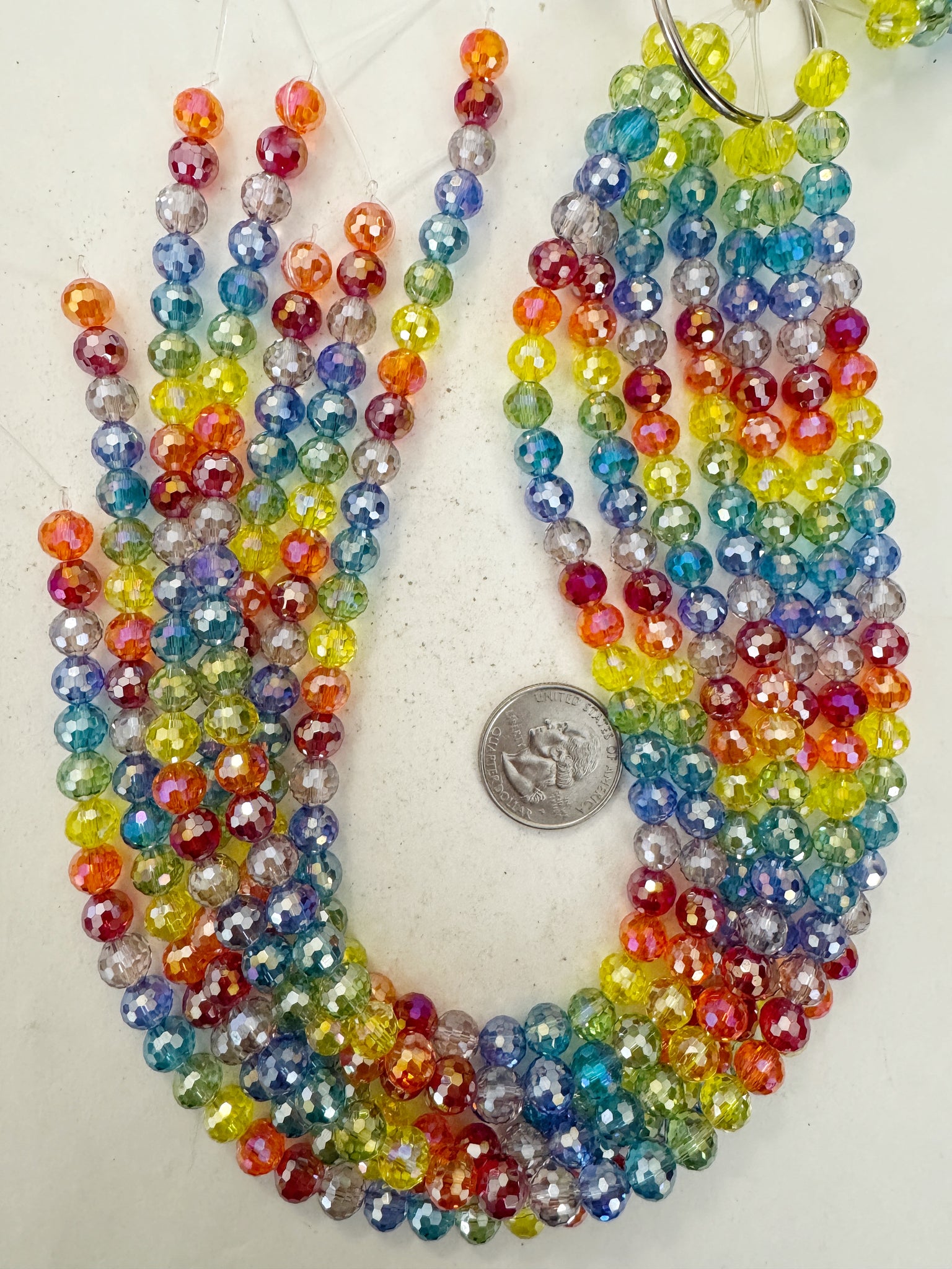 rainbow mix, white ab coated, glass, 8mm fancy cut faceted round, 14" strand, sold per strand