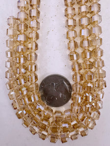 white flash coated dark peach, fancy cut, vintage look glass, 7mm faceted bicone barrel, 9.5" strand, sold per strand