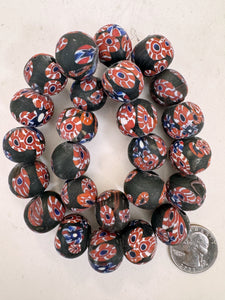 matte multi color black millefiori motif, vintage look glass, 19-20mm round mix, 15" strand, sold per strand
