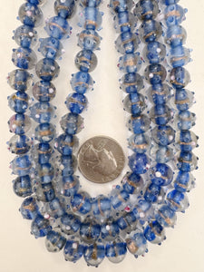 clear dark periwinkle blue white pink metallic copper inside lined dotted, vintage look glass, 11x9mm rondelle mix, 15" strand, sold per strand