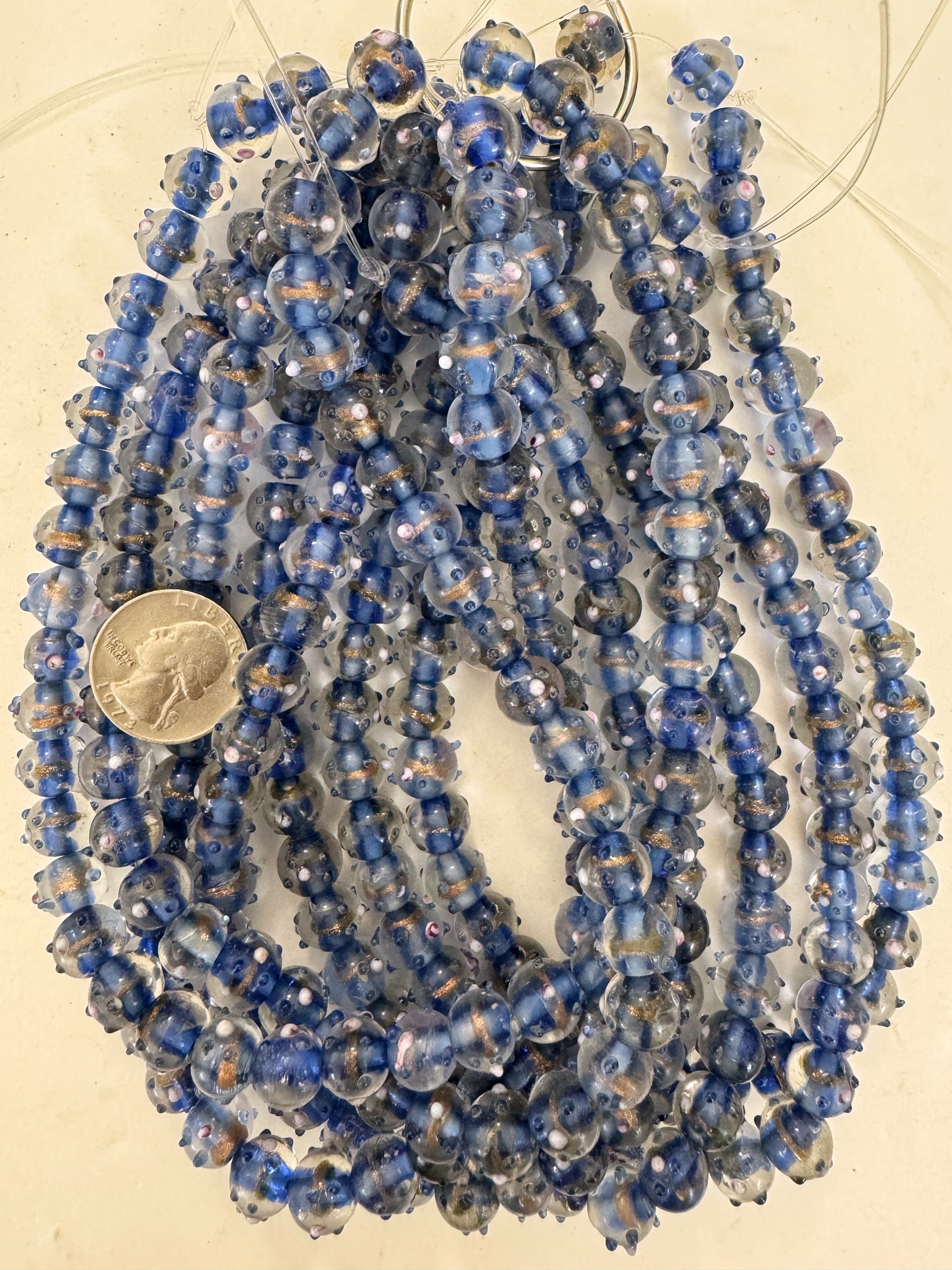 clear dark periwinkle blue white pink metallic copper inside lined dotted, vintage look glass, 11x9mm rondelle mix, 15" strand, sold per strand