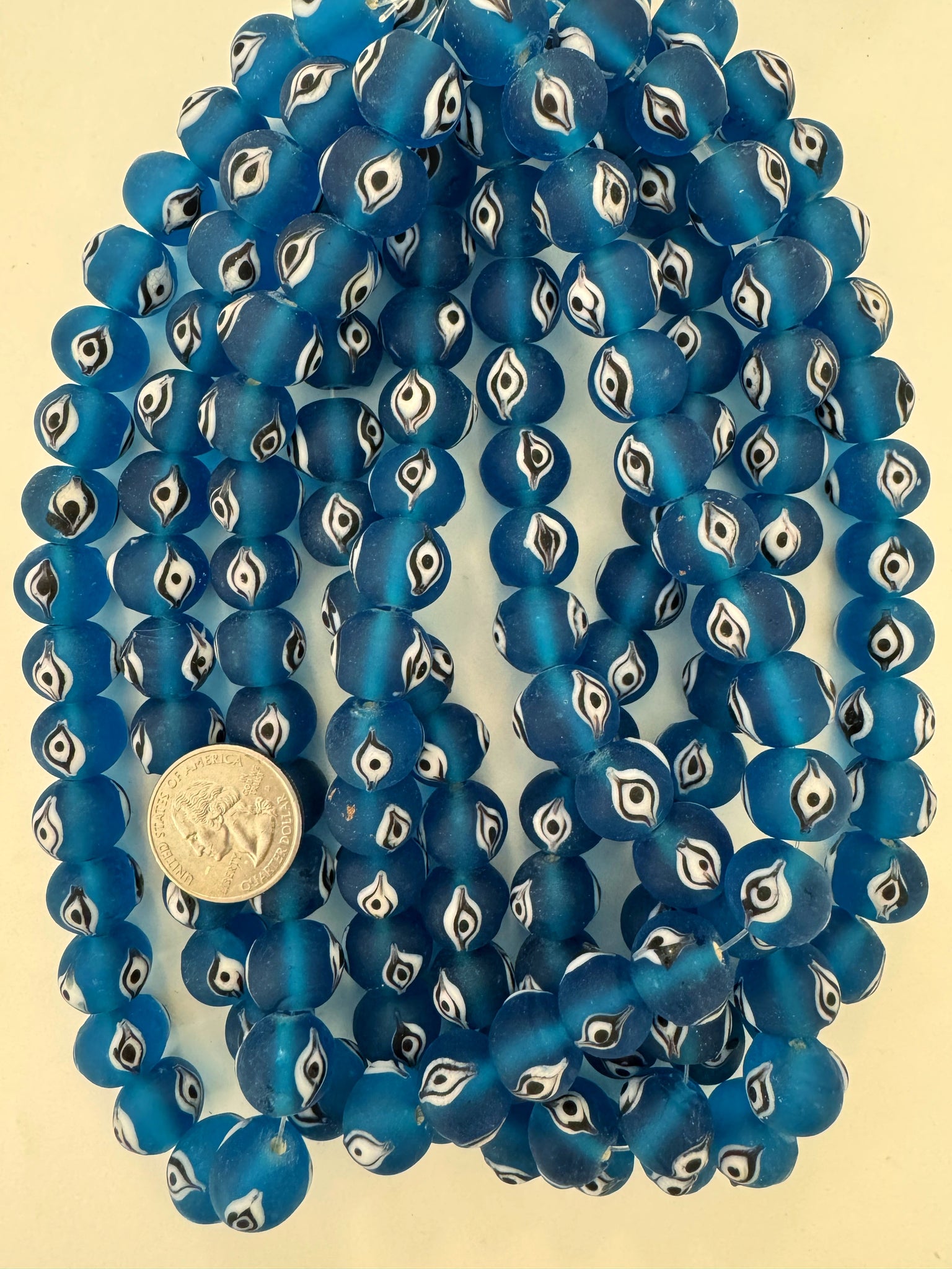 matte finish dark electric blue black white evil eye motif, vintage look glass, 14x12mm rondelle, 15" strand, sold per strand