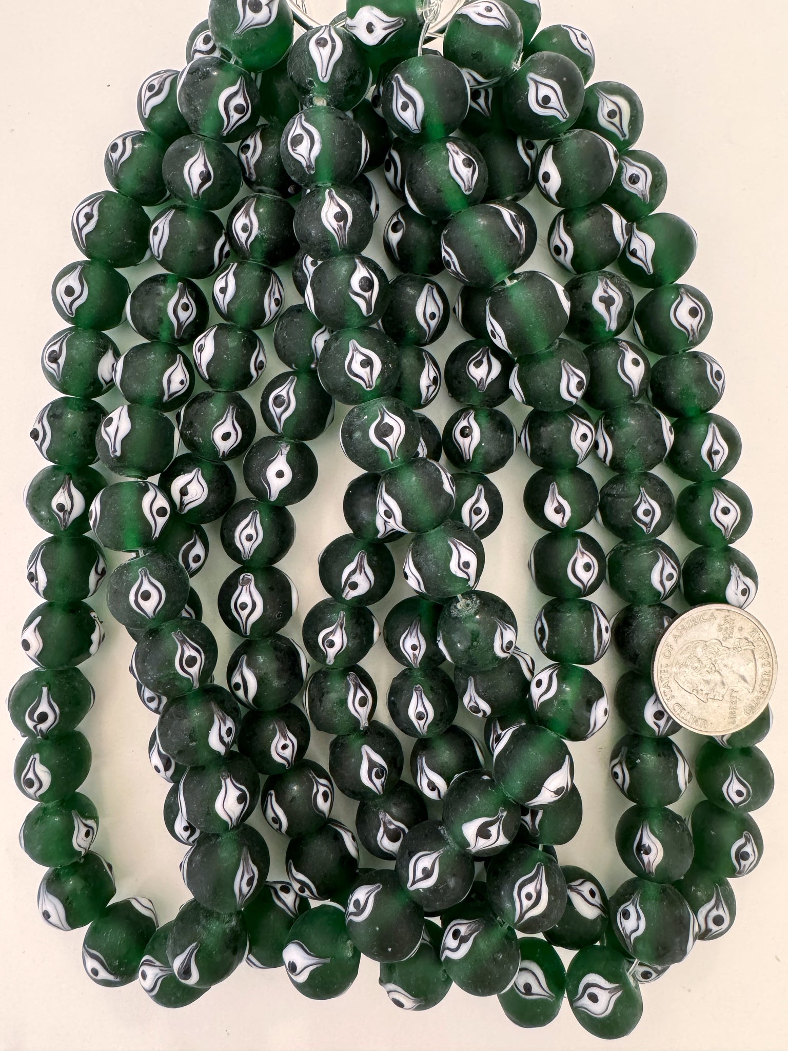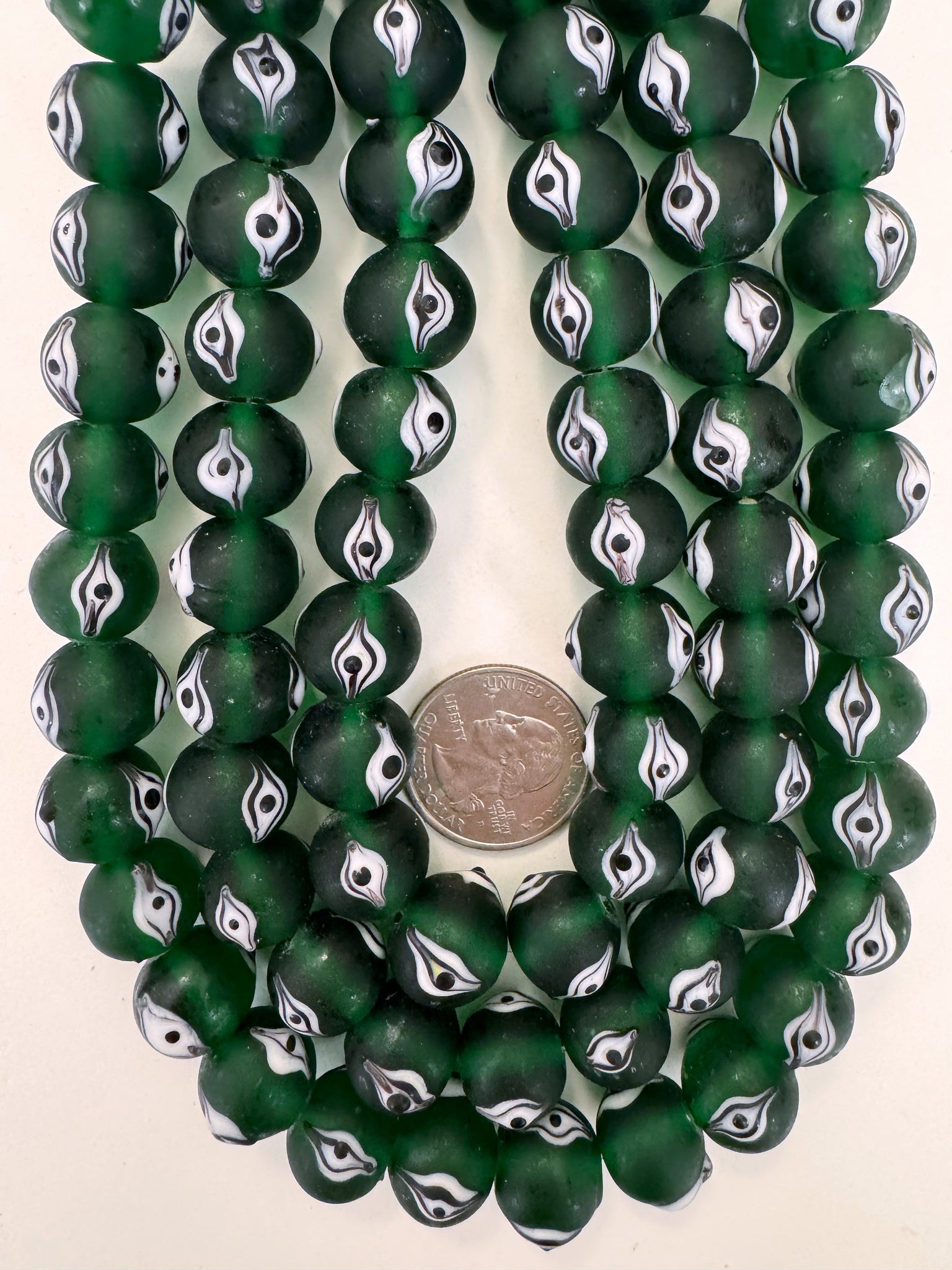 matte finish dark green black white evil eye motif, vintage look glass, 14x12mm rondelle, 15" strand, sold per strand