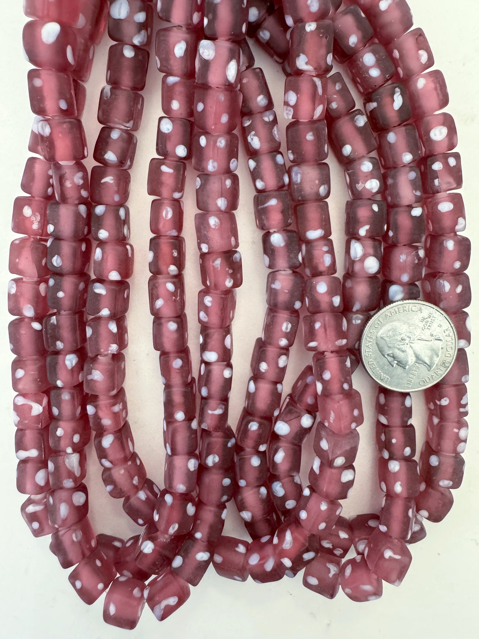 matte dark pale red purple white polka dot, vintage look glass, 9mm cube, 15" strand, sold per strand