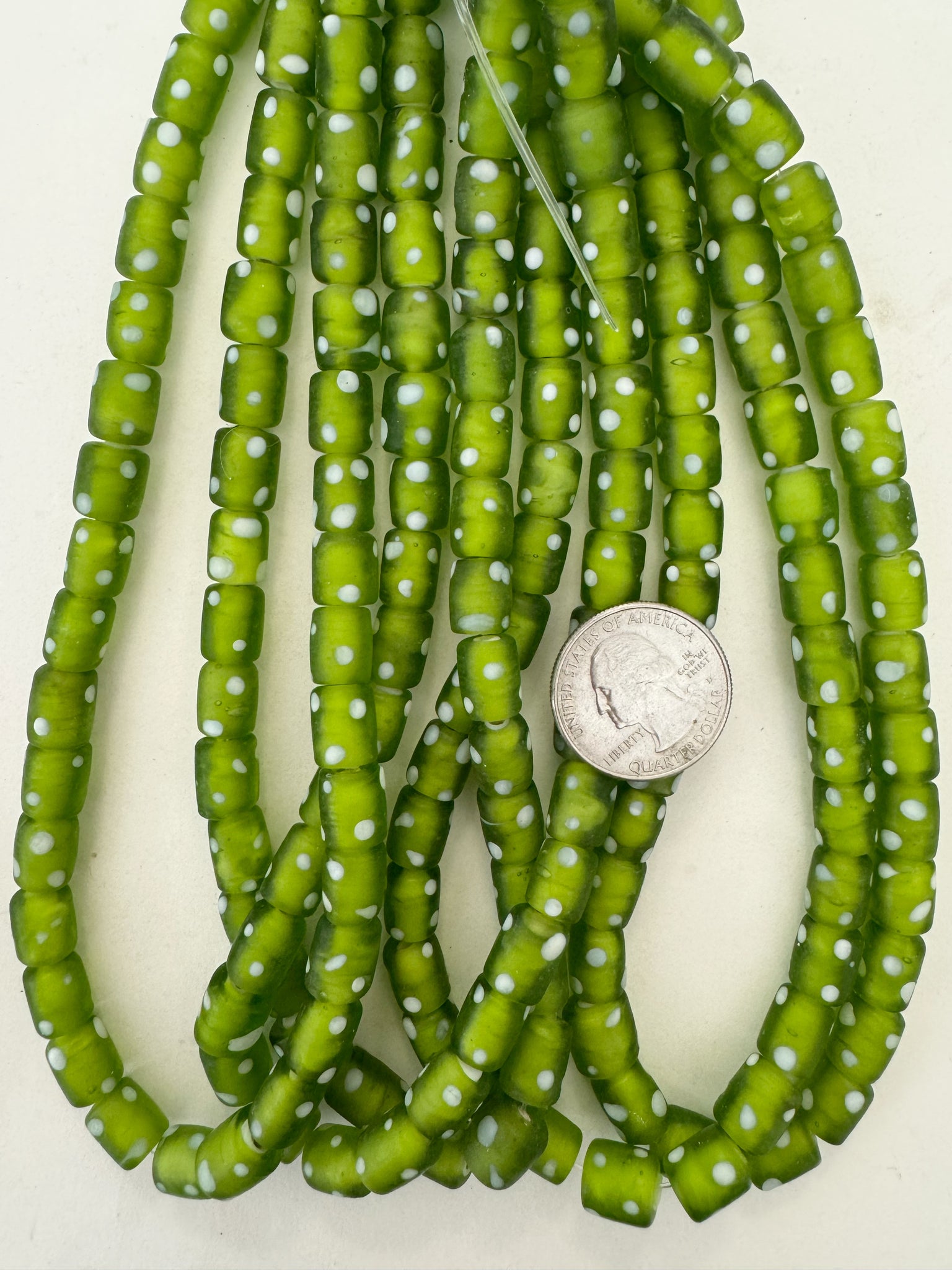 matte pale green white polka dot, vintage look glass, 11x8mm tube, 15" strand, sold per strand