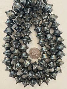 yellowed metallic silver coated , single color, vintage look glass, 19x14mm pointed rondelle, 15" strand, sold per strand