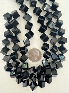 black, single color, vintage look glass, 10mm corner to corner drilled faceted cube, 13" strand, sold per strand