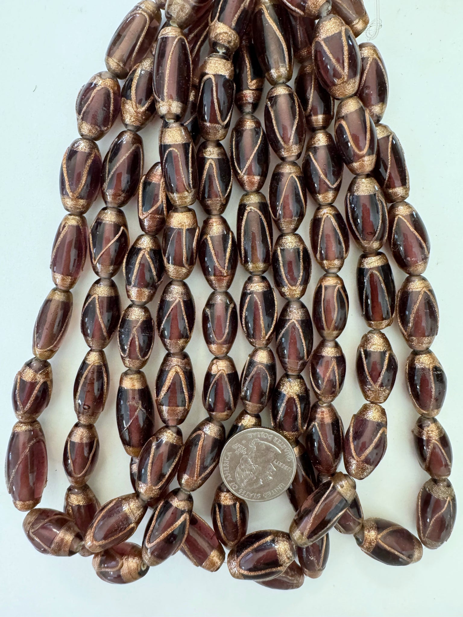 dark red purple metallic copper swirl, vintage look glass, 20-27mm bowed tube mix, 15" strand, sold per strand