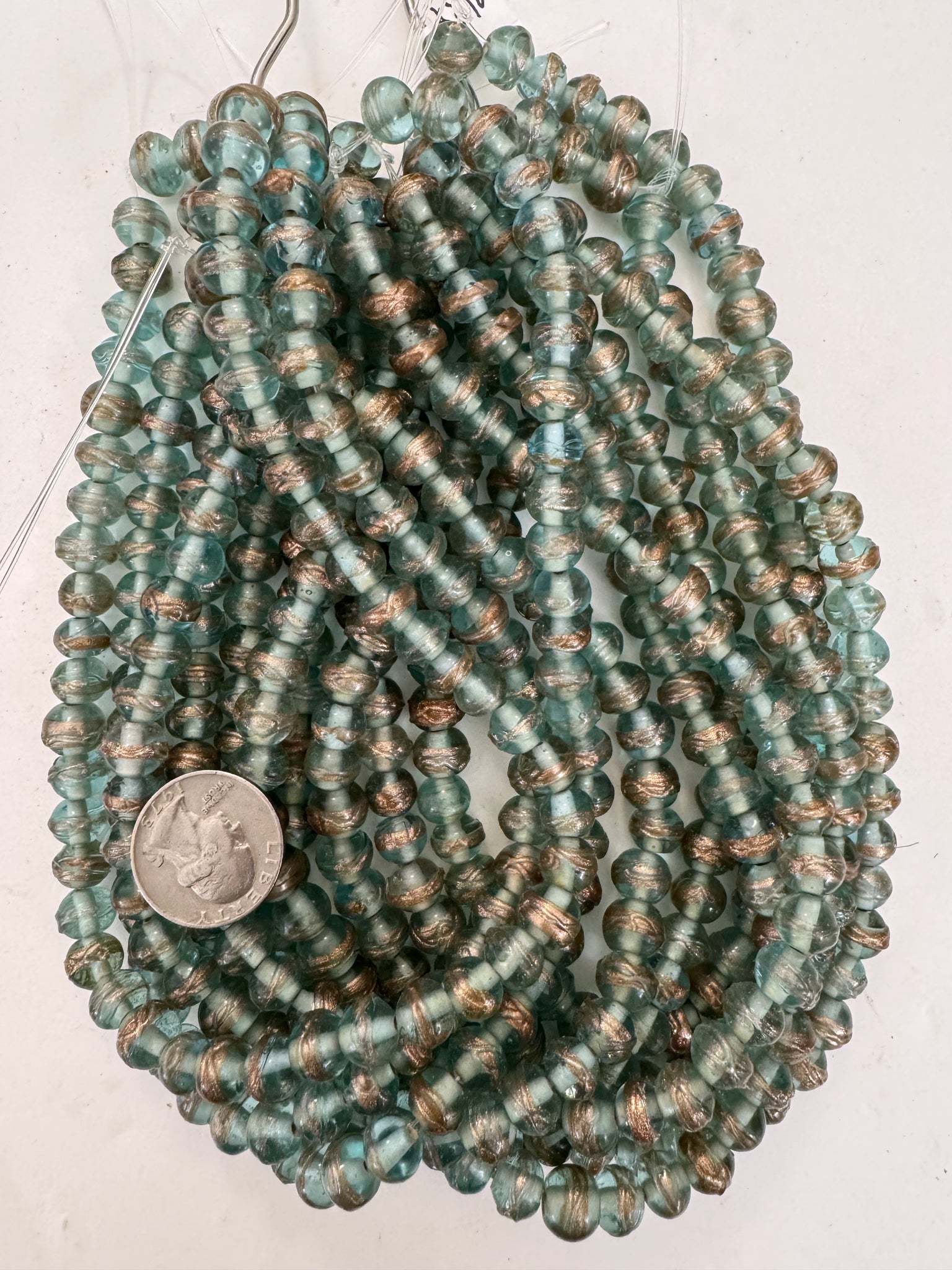 pale aqua blue metallic copper swirl stripe, vintage look glass, 9x7mm rondelle, 15" strand, sold per strand
