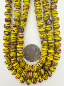 yellow red black white metallic copper swirl, vintage look glass, 9mm round, 15" strand, sold per strand