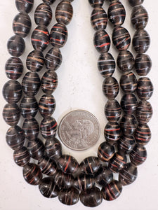 dark root beer brown metallic copper stripe swirl motif, vintage look glass, 9mm barrel, 15" strand, sold per strand