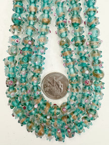 clear blue green magenta white metallic copper swirl dotted inside lined motif, vintage look glass, 10x8mm rondelle, 15" strand, sold per strand