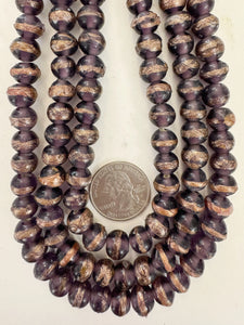 dark purple metallic copper swirl stripe motif, vintage look glass, 10x8mm rondelle, 15" strand, sold per strand