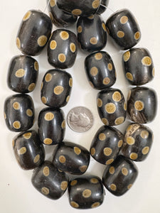 black off white golden horn, medium polka dot motif, 32x24mm barrel tube, 15" strand, sold per strand