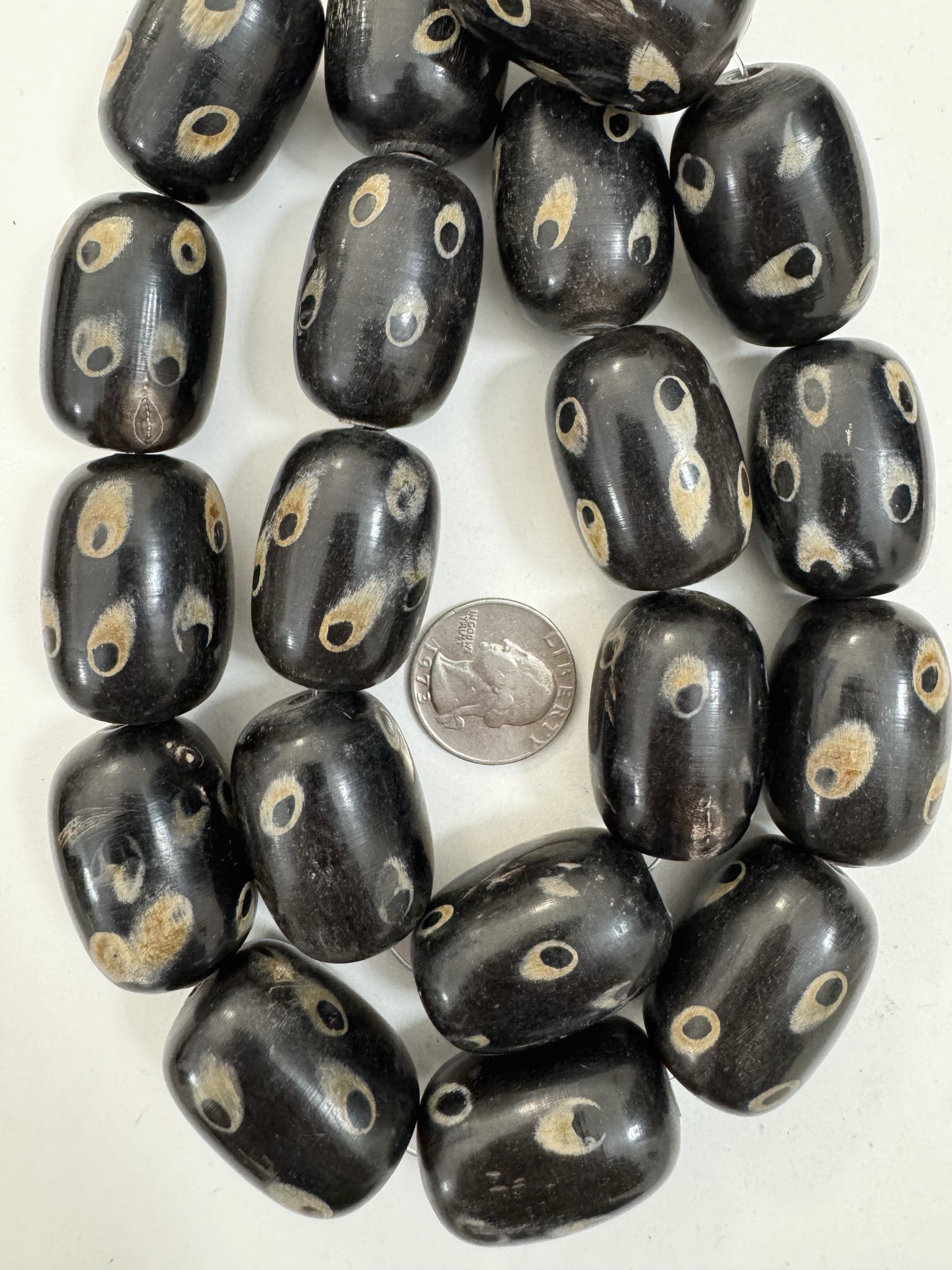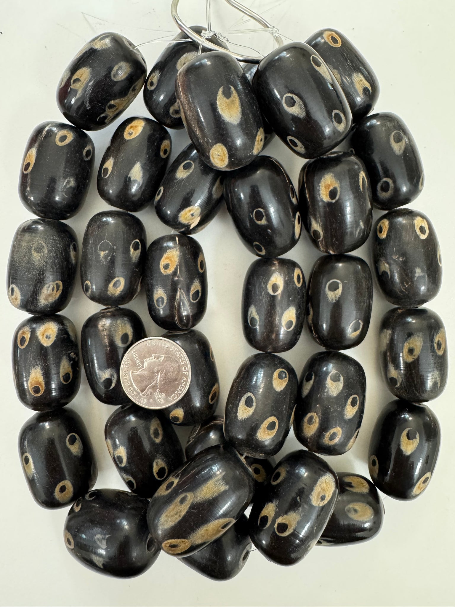 black off white golden horn, evil eye motif, 32x24mm barrel tube, 15" strand, sold per strand