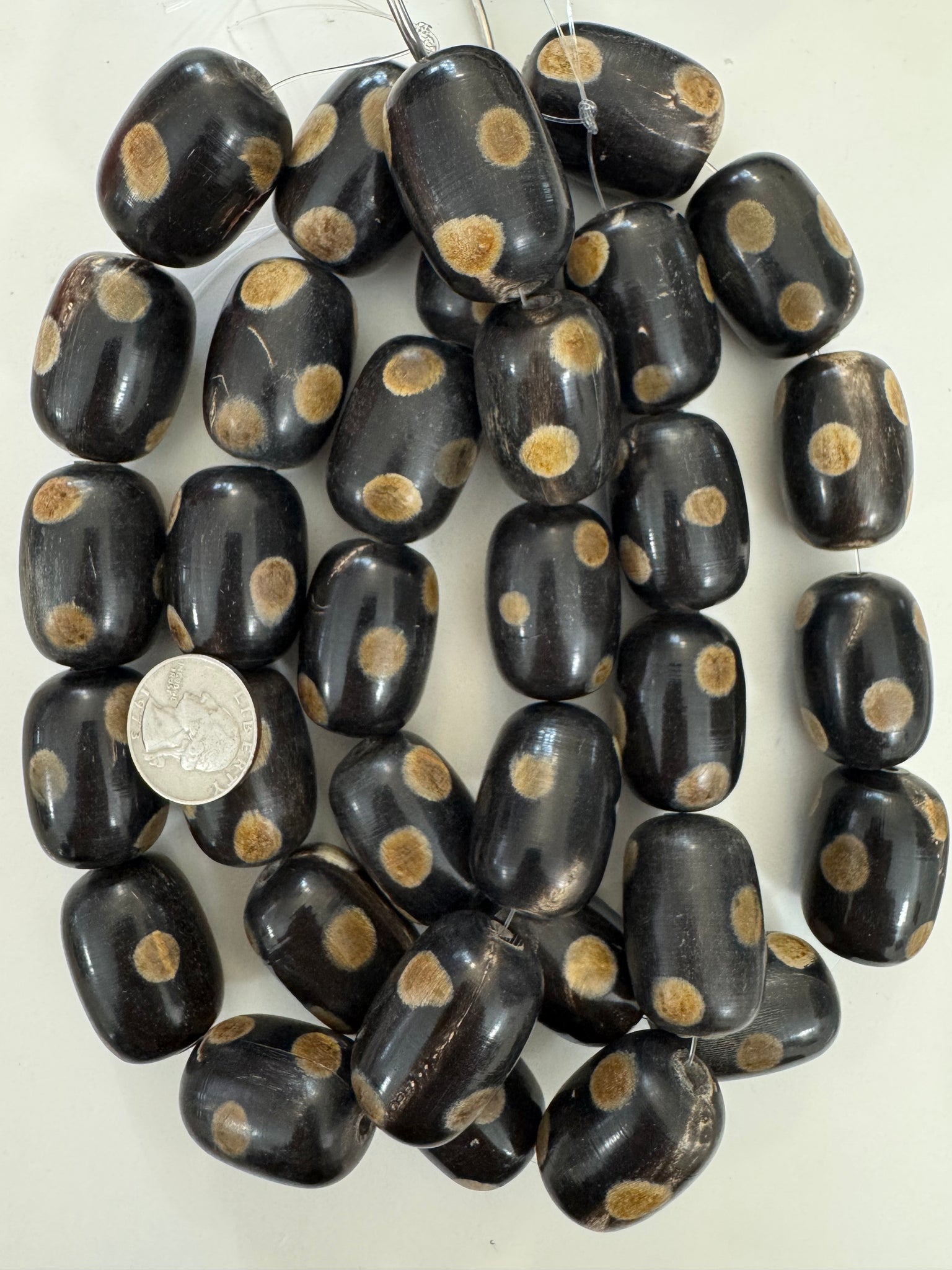 black off white golden horn, medium polka dot motif, 32x24mm barrel tube, 15" strand, sold per strand