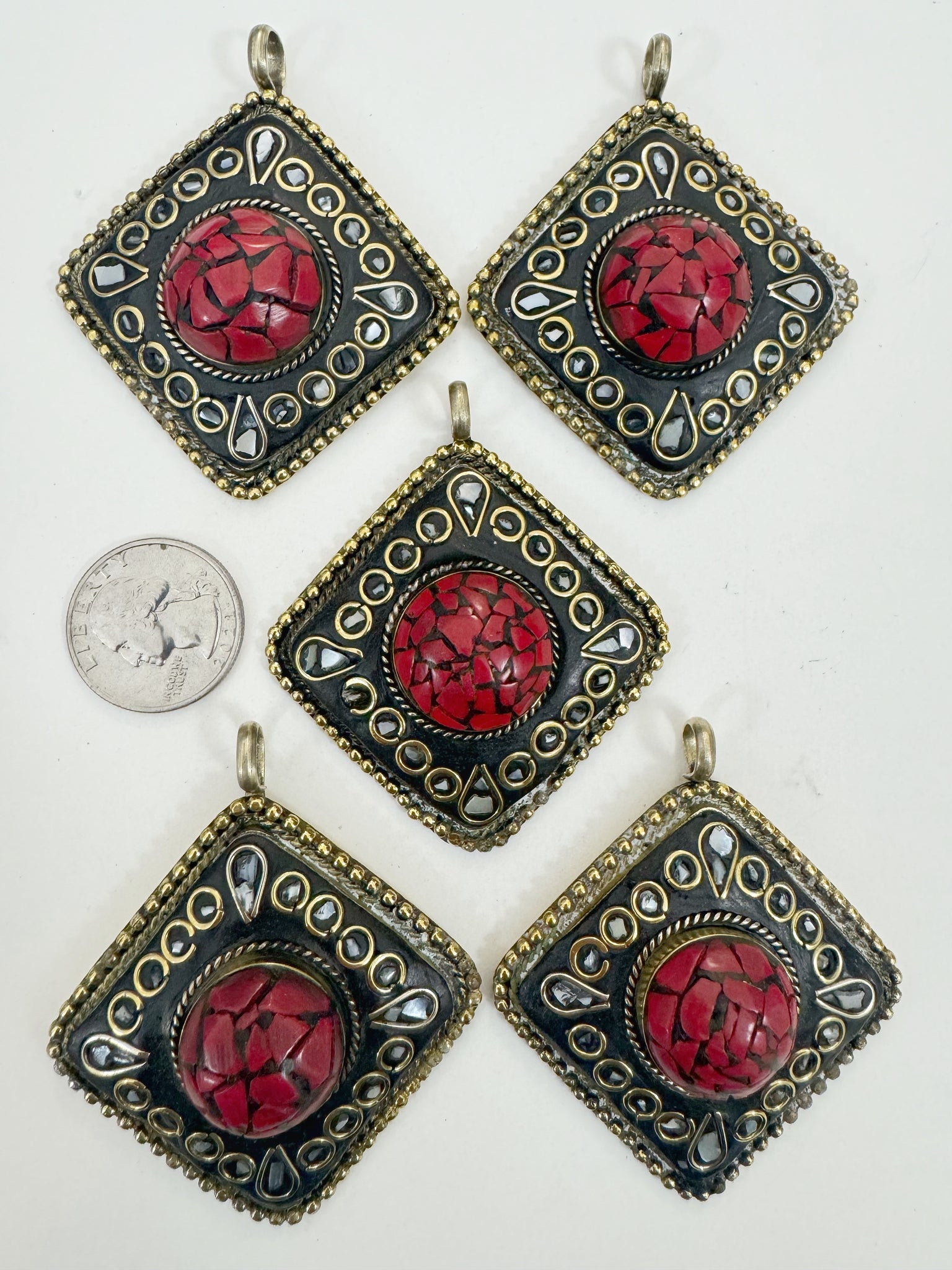 brass, coral red enhanced magnesite mop shell inlays, 65x58x18mm diamond shape tibetan style pendant, sold per piece