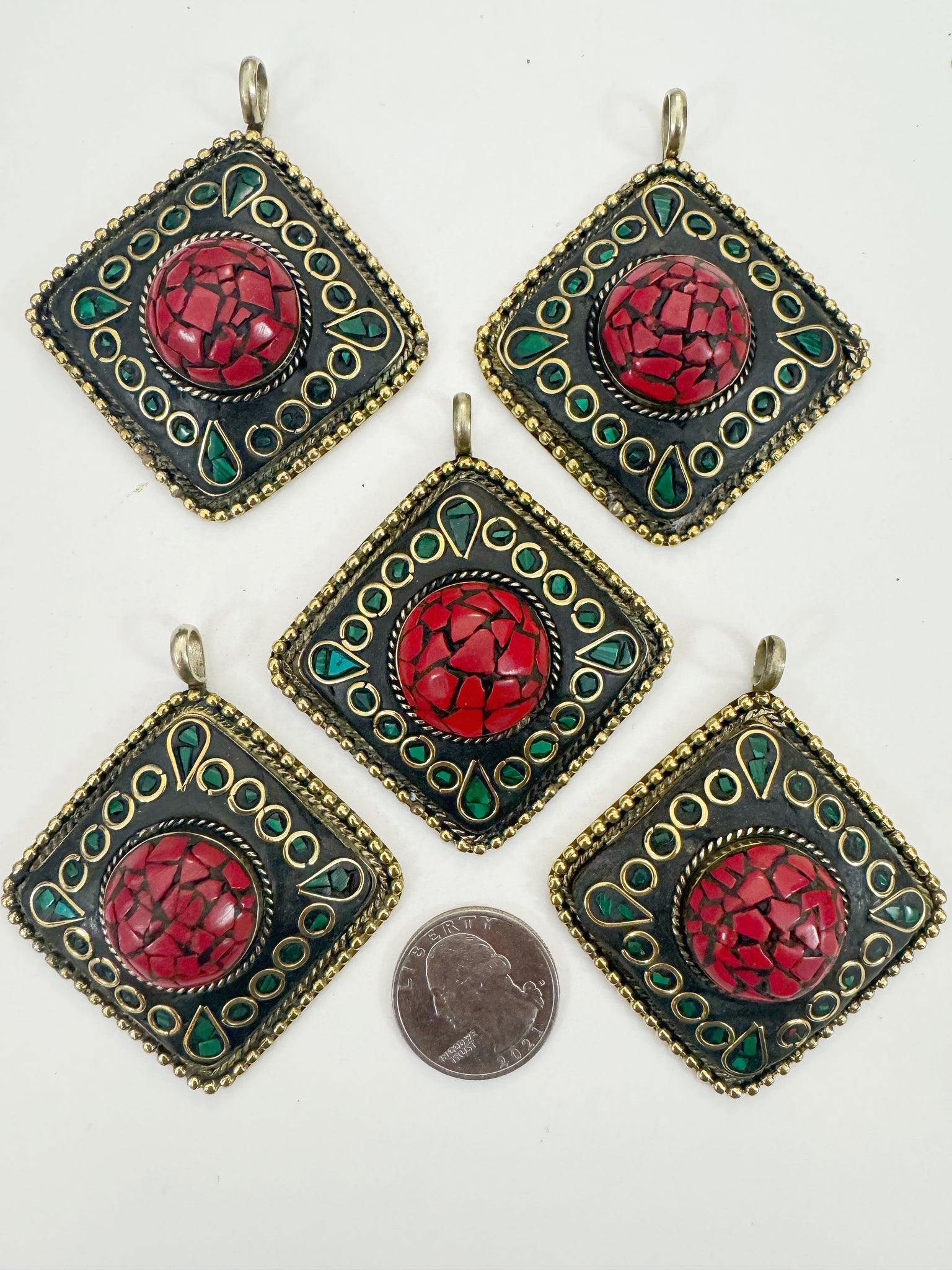 brass, coral red malachite green enhanced magnesite inlays, 65x58x18mm diamond shape tibetan style pendant, sold per piece