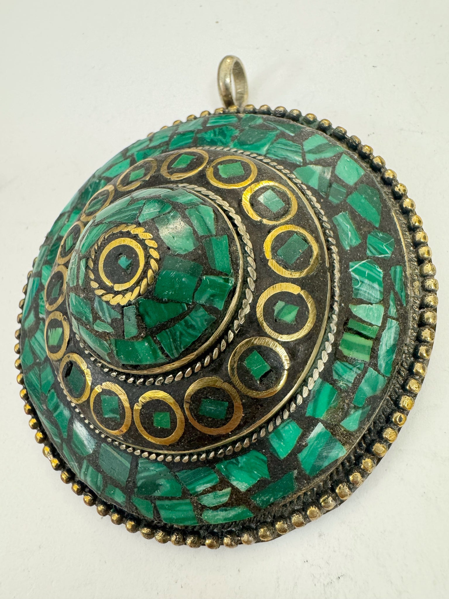 brass, malachite green enhanced magnesite inlays, 80x68x22mm oval coin tibetan style pendant, sold per piece