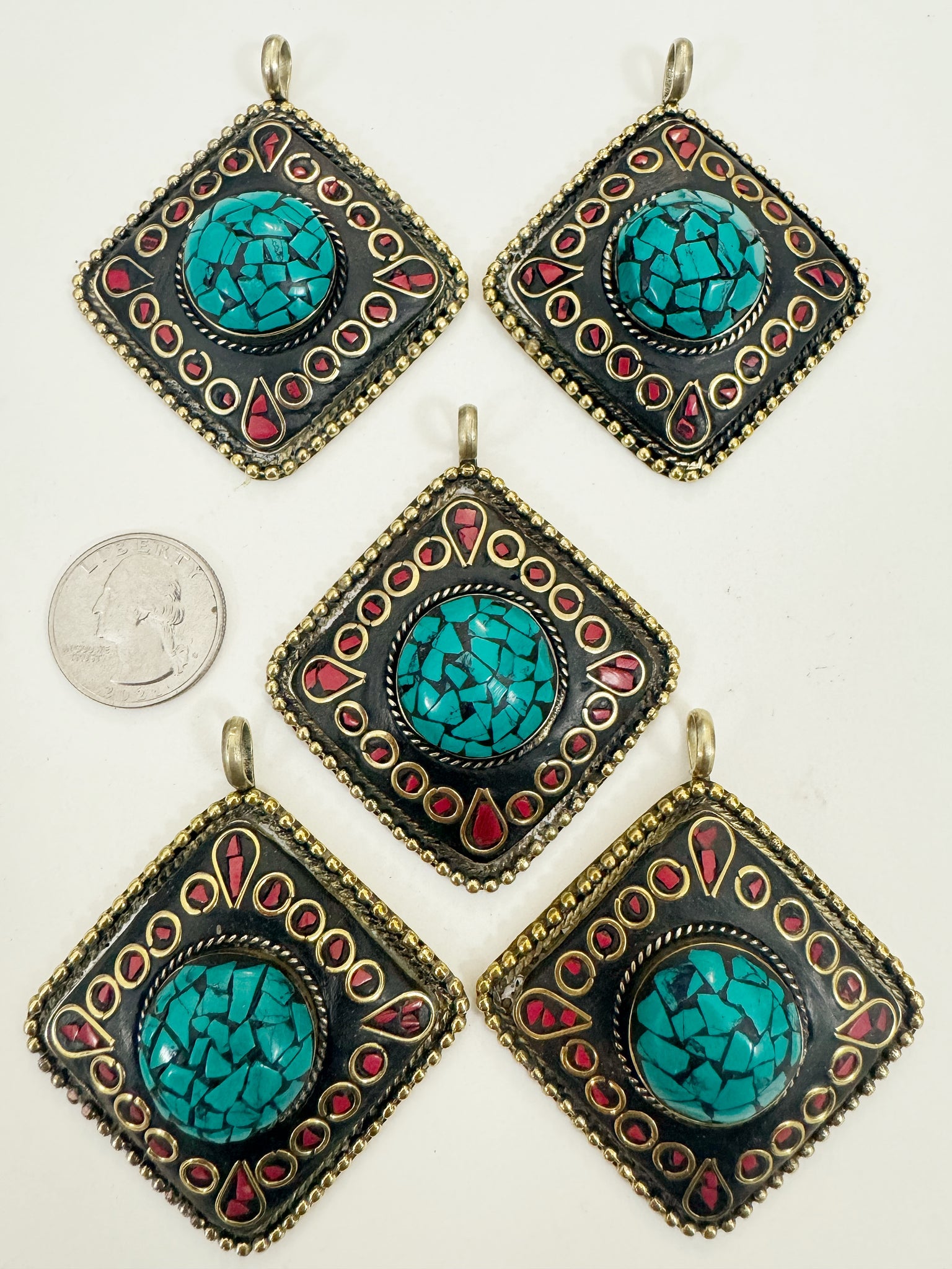 brass, turquoise blue coral red enhanced magnesite inlays, 65x58x18mm diamond shape tibetan style pendant, sold per piece