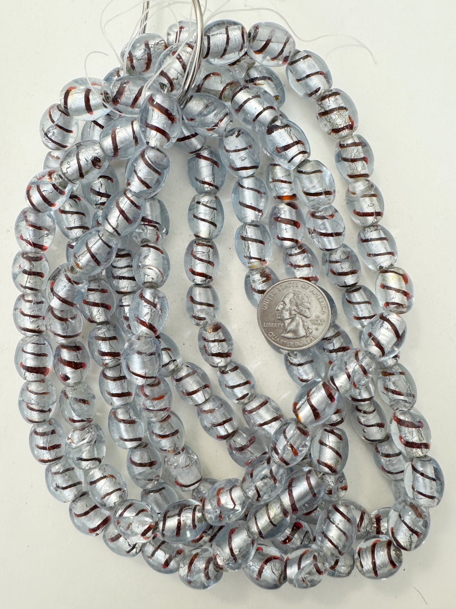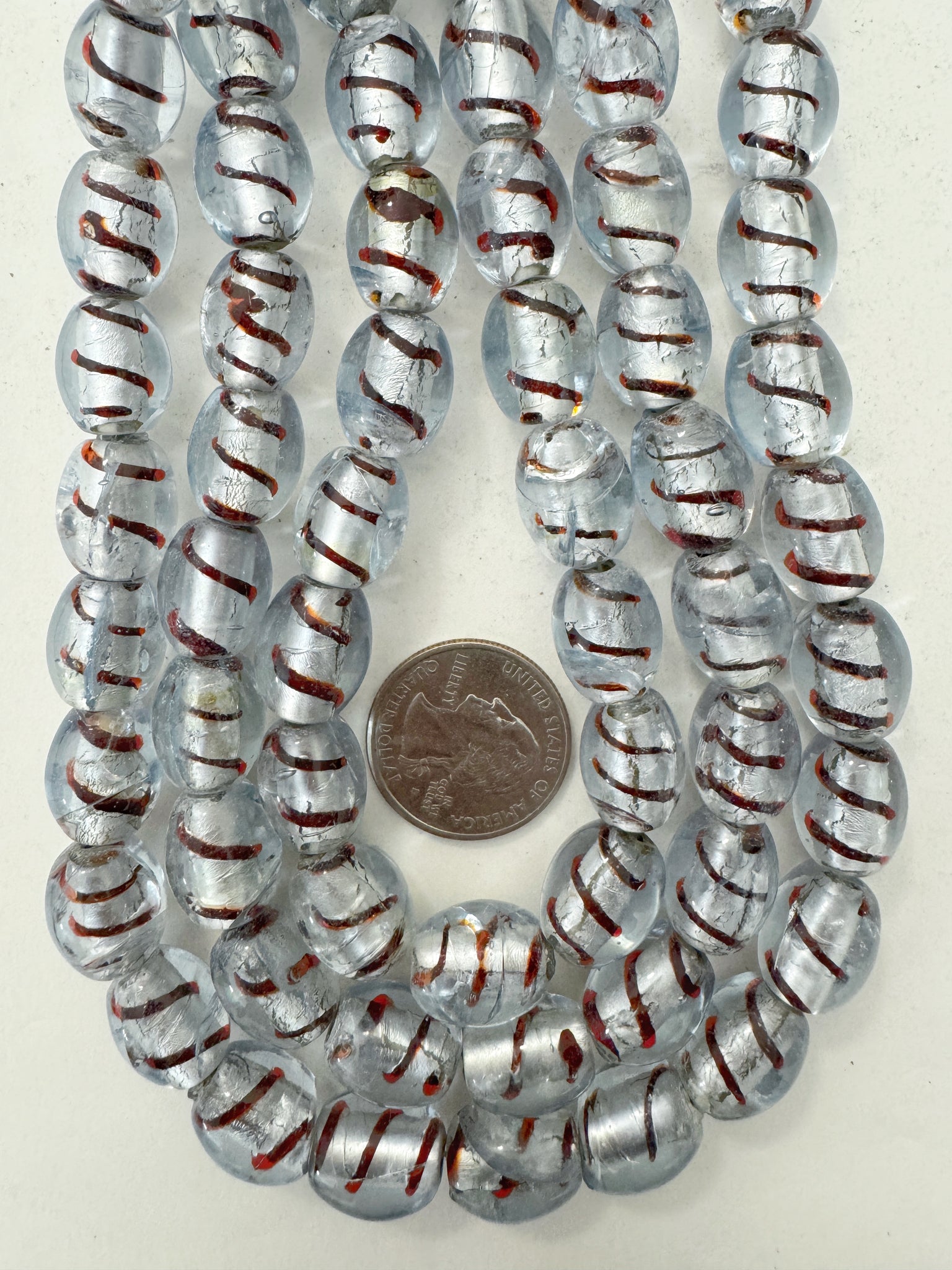 clear brown spiral metallic silver inside lined, vintage stock glass, 15x12mm barrel, 15" strand, sold per strand
