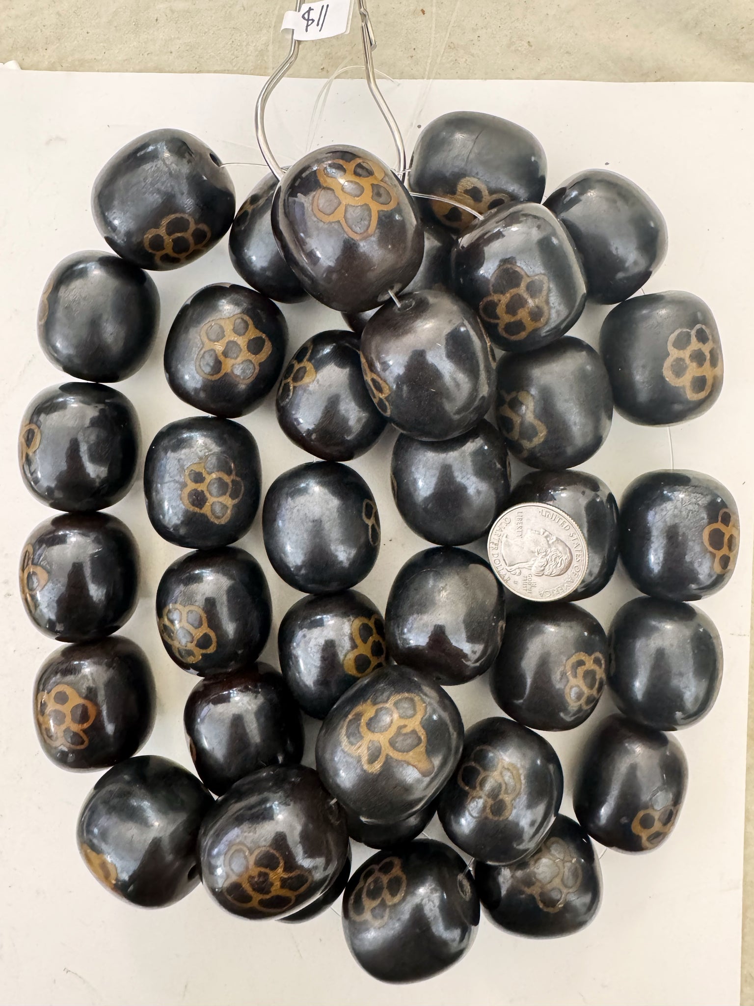 dark brown golden flower motif, faux bone, vintage look resin, 32x30mm barrel, 15" strand, sold per strand