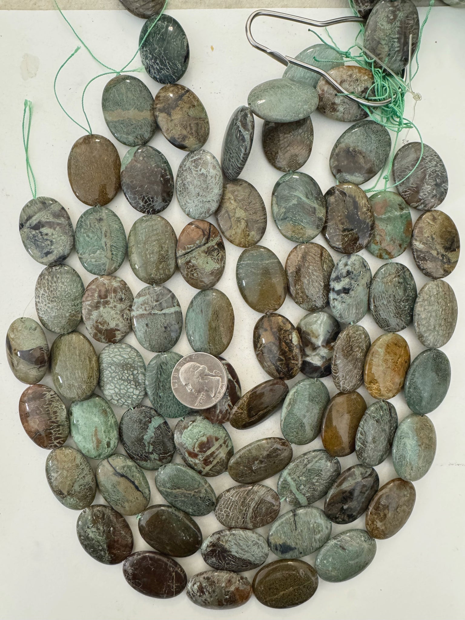 green snake skin jasper, 30x22x8mm oval, 15" strand, sold per strand