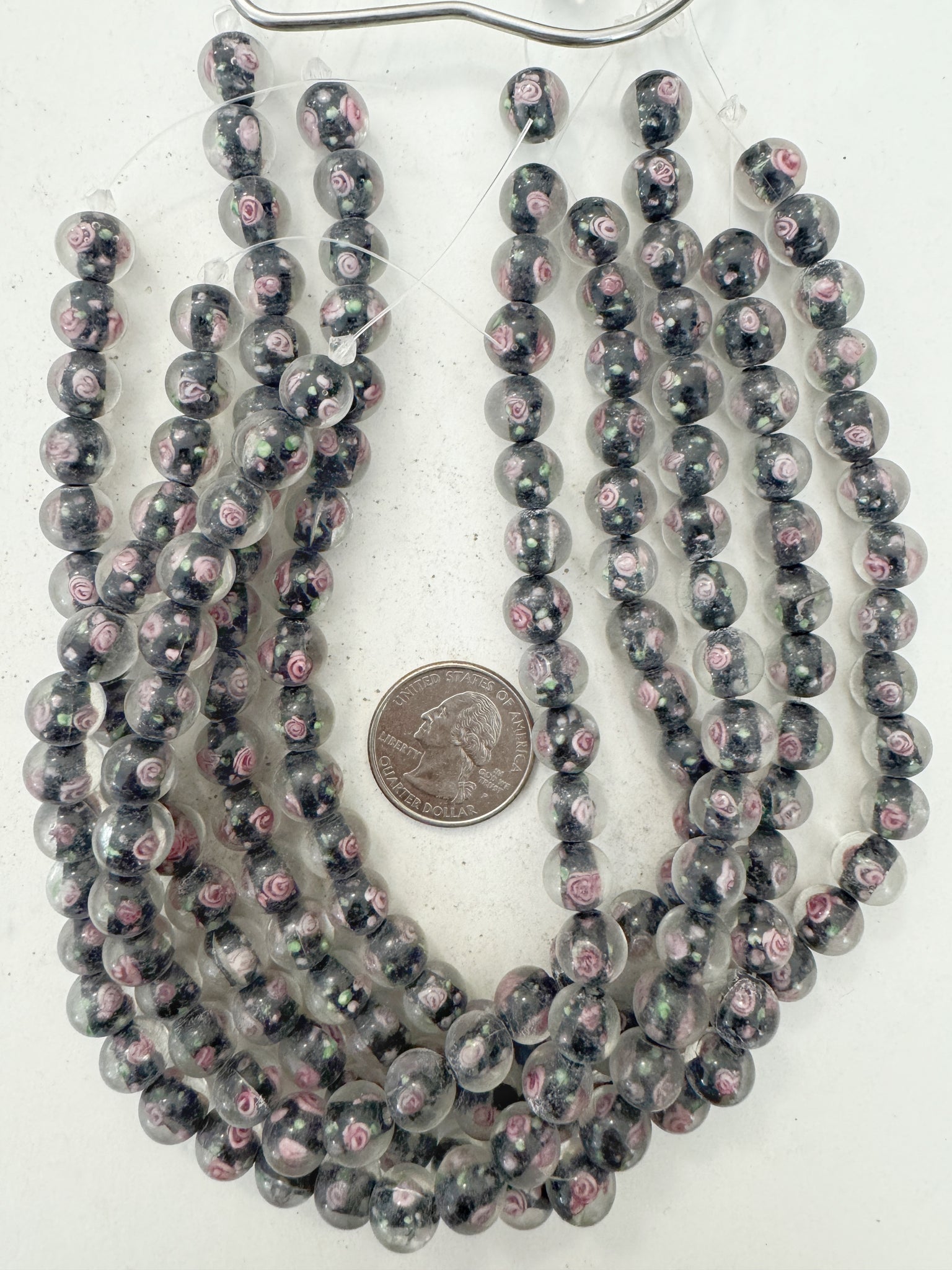 pink rose motif black inside lined, dull finish, vintage stock glass, 10mm round, 12" strand, sold per strand