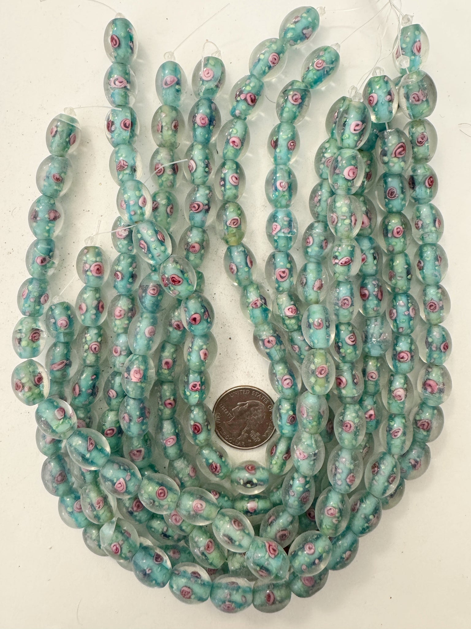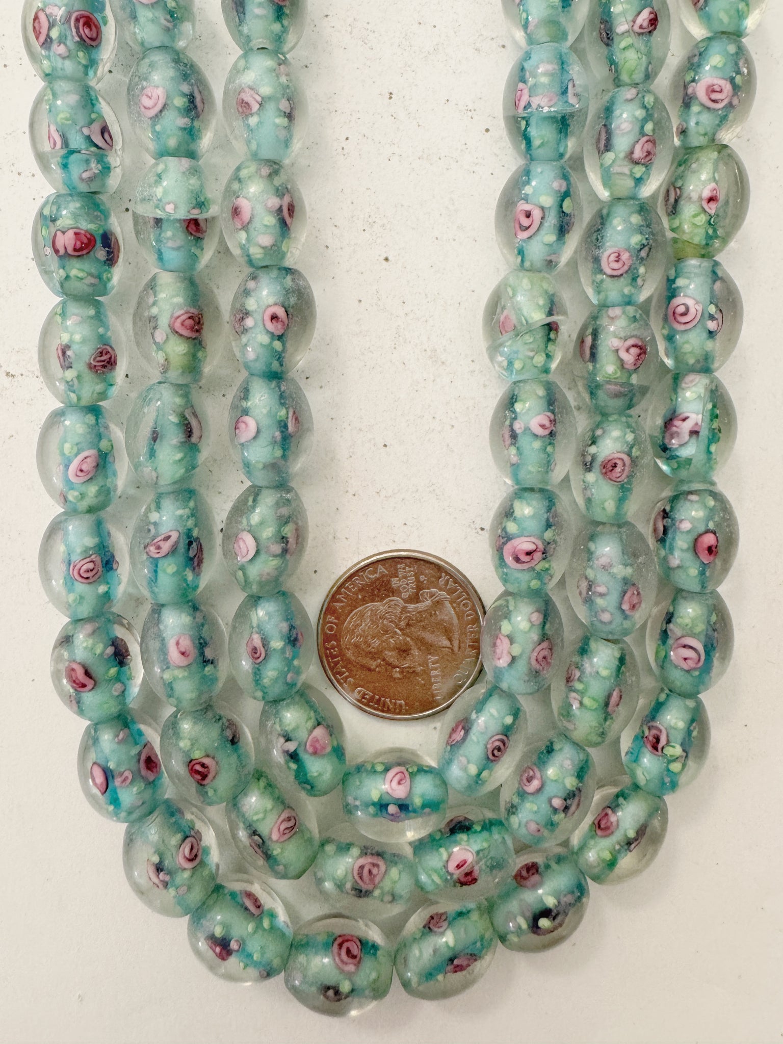 pink rose motif light aqua blue inside lined, dull finish, vintage stock glass, 14x12mm bowed tube, 14" strand, sold per strand