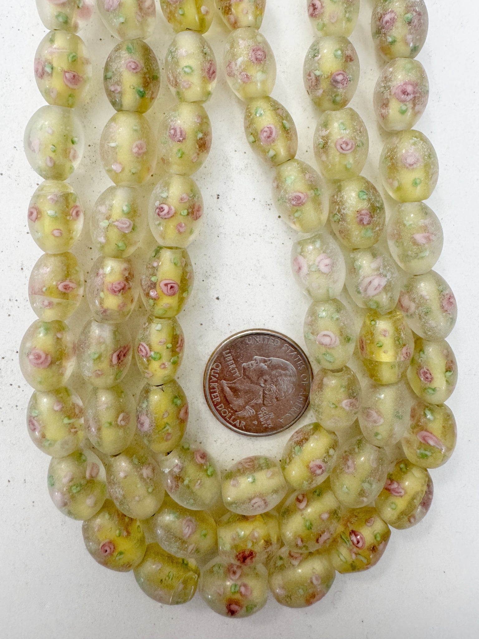 pink rose motif pale yellow inside lined, dull finish, vintage stock glass, 14x12mm bowed tube, 14" strand, sold per strand