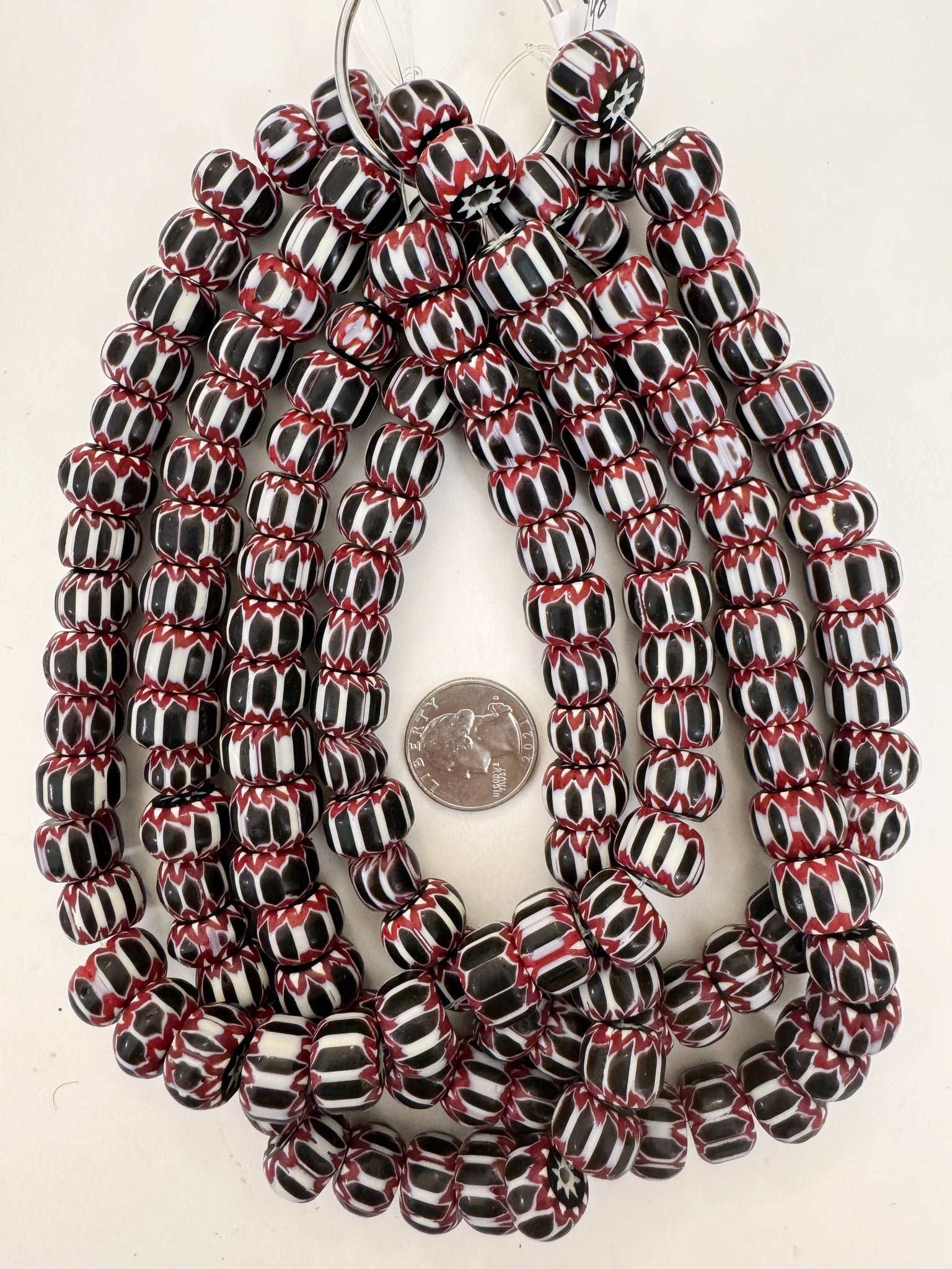 red white black chevron motif, vintage look glass, 10-15mm rondelle mix, 15" strand, sold per strand